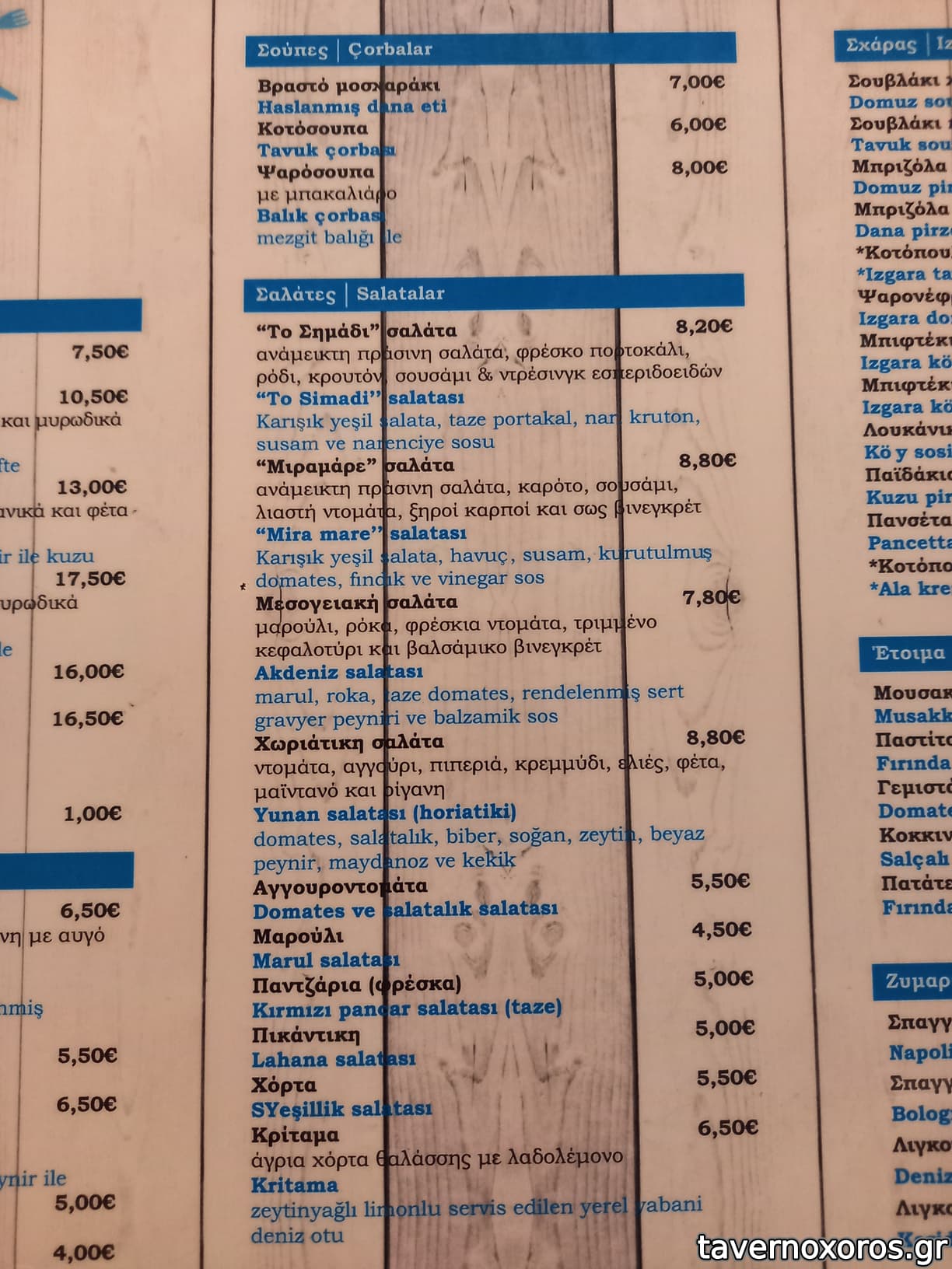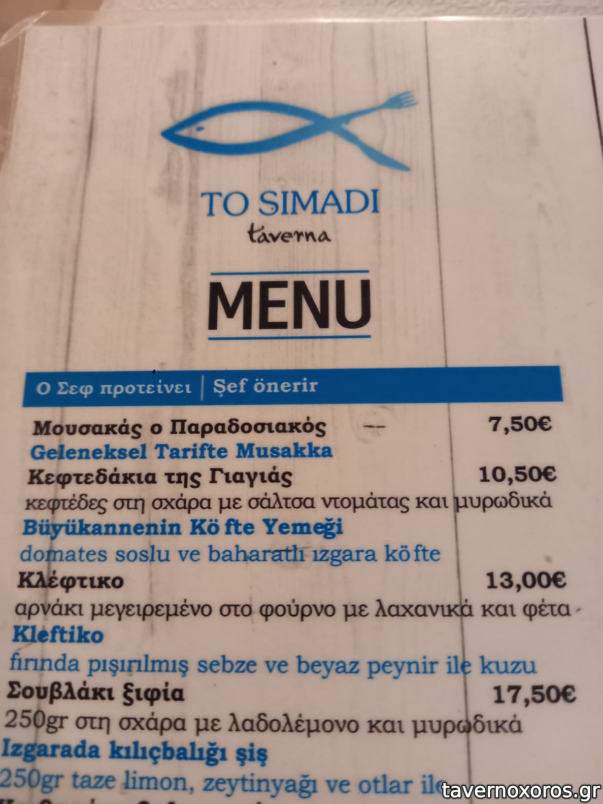 | Λέξεις κλειδιά | To Simadi, #ψαρόσουπα, #μουσακάς, #κλέφτικο, #μπιφτεκάκια, #βραστό, #κολοκυθάκια, #μελιτζανοκεφτέδες, #χαλούμι, #μαστέλο, #γαύρος μαρινάτος, #φάβα, #κοτόσουπα, #χταπόδι, #μπαρμπούνια, #κουτσομούρες, #σαρδέλα, #γαρίδες, #μύδια, #γαύρος, #μπακαλιάρος, #γεμιστά, #παστίτσιο, #μακαρονάδες, #κοκκινιστό, #παϊδάκια, #ψαρονέφρι, #κοτόπουλο, #λουκάνικο, #μπιφτέκι, #σουβλάκι, #χοιρινή, #μοσχαρίσια μπριζόλα, #μπιφτέκι γεμιστό, #κοτόπουλο σχάρας |