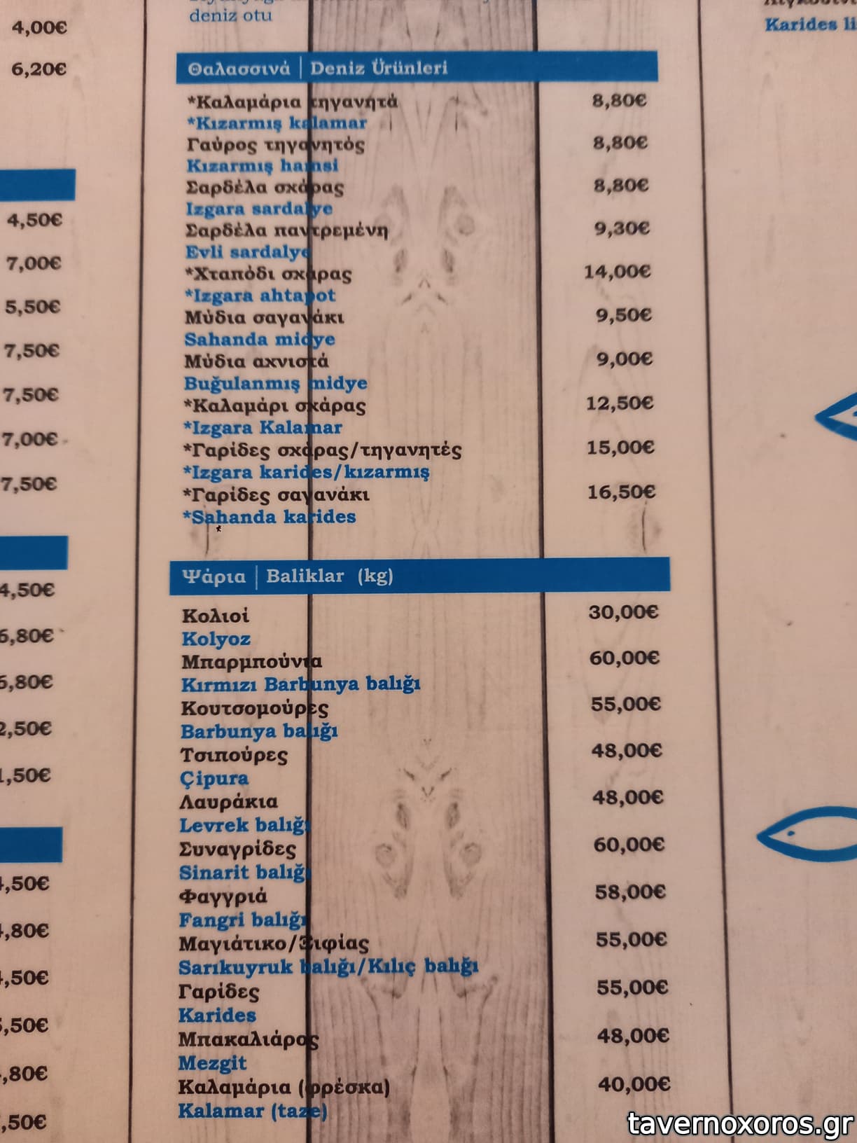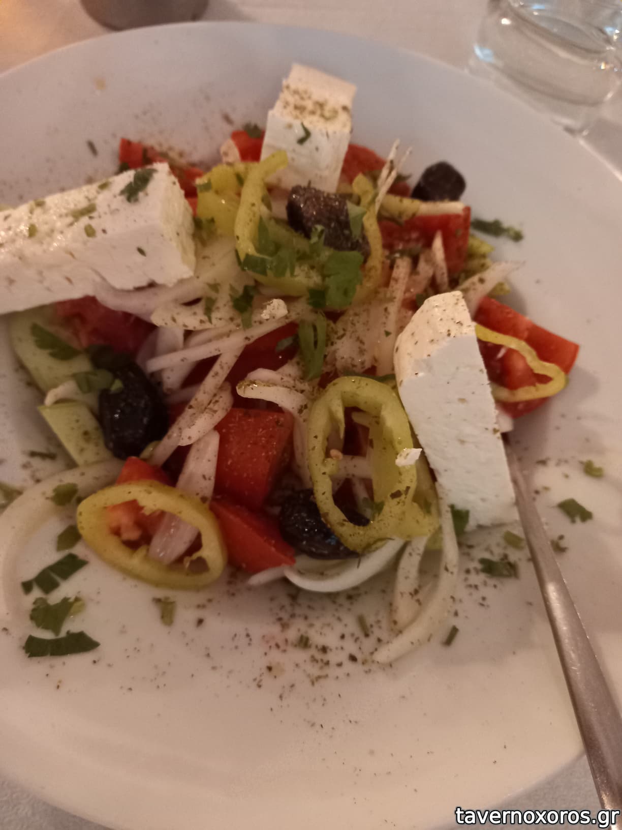 Δοκιμάστηκαν χωριάτικη, κολοκυθάκια τηγανητά, φέτα, πατάτες τηγανητές, σαρδέλα παντρεμένη, κασεροκροκέτες, λινγκουίνι θαλασσινών, καλαμαράκια τηγανητά, γαύρος τηγανητός και μπαρμπούνια τηγανητά. Όλα καλά χωρίς να ενθουσιάζει κάτι.