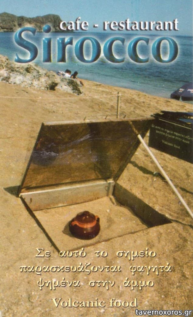 Η ατραξιόν της ταβέρνας είναι ένας λάκκος στην άμμο, όπου τοποθετούν για τουριστικούς λόγους διάφορες γάστρες και τον σκεπάζουν με ένα μεγάλο μεταλλικό καπάκι. Υποτίθεται ότι το φαγητό σιγοψήνεται με την θερμοκρασία της άμμου. Δοκιμάσαμε καταπληκτικό χταπόδι σαγανάκι μουσταρδάτο και θεσπέσια αστακομακαρονάδα. Τιμές υψηλές.