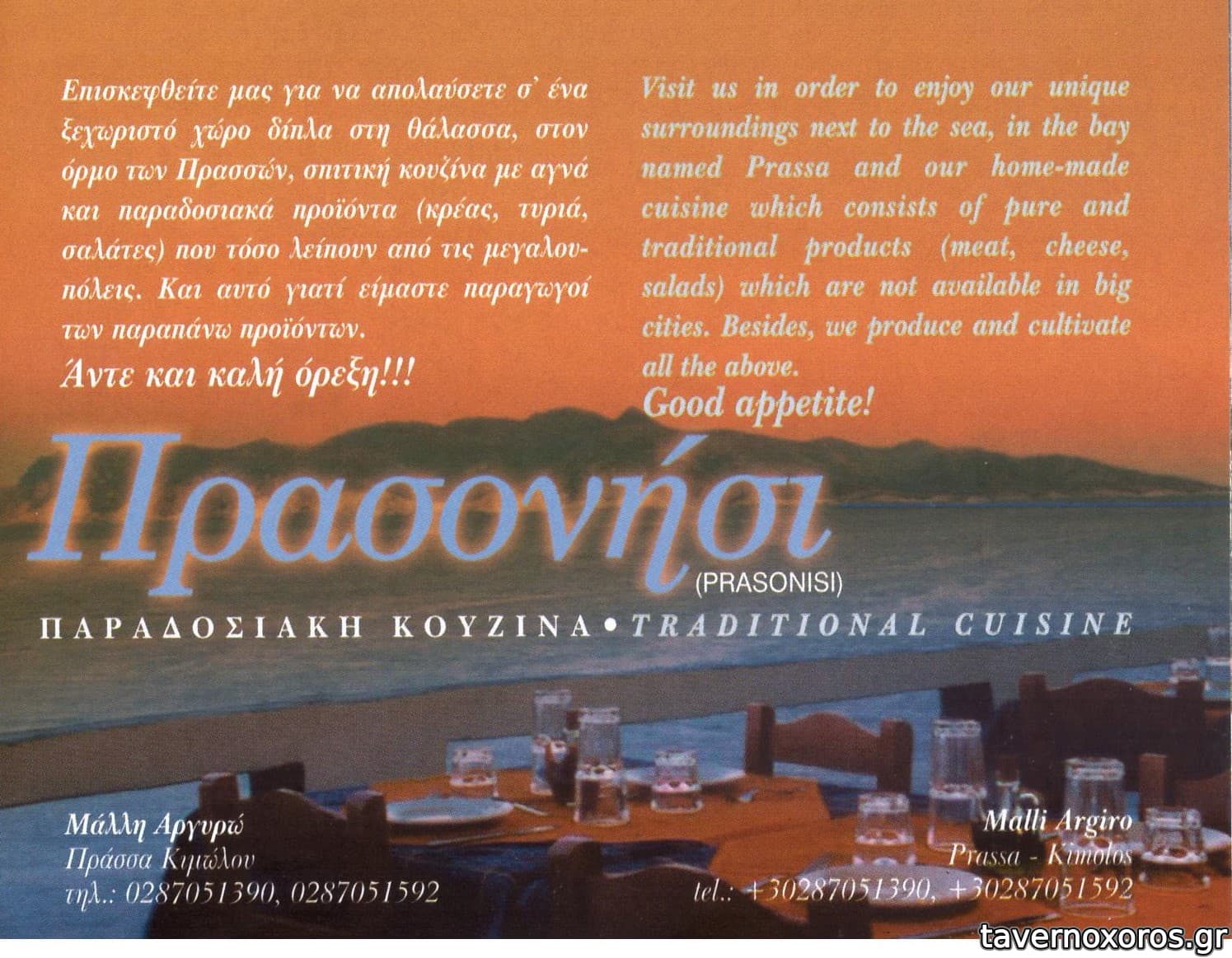 Έκατσα Αύγουστο 2012. Ταβερνάκι με ωραία θέα μπροστά στο Πρασσονήσι και κοντά στην πανέμορφη παραλία Πρασσών. Η κυρία που το έχει καλή και ευγενική. Τα φαγητά όλα νόστιμα, όπως και το χύμα κρασί της. Μείναμε ευχαριστημένοι και θα το πρότεινα.