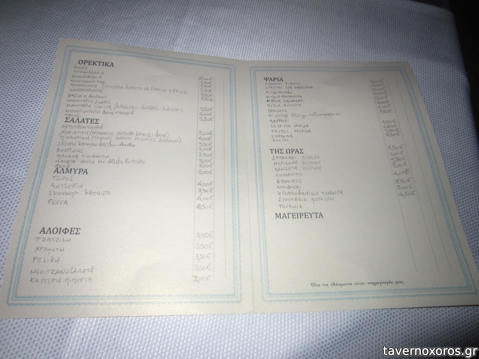 - Κλασικός κατάλογος με κρεατικά και ψαρικά. Ότι πήραμε ήταν οκ. Στα μεγάλα ατού, το χύμα κρασί του που ήταν πολύ καλό (και όχι συσκευασίας).