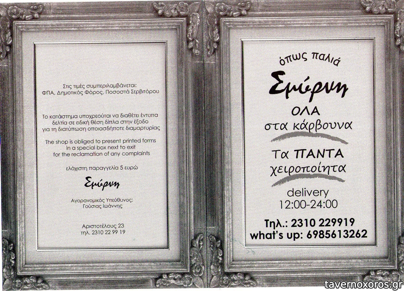 Η Σμυρνιά". Ιδιοκτησία Βασιλική Γούσια & Ιωάννης Γούσιας.