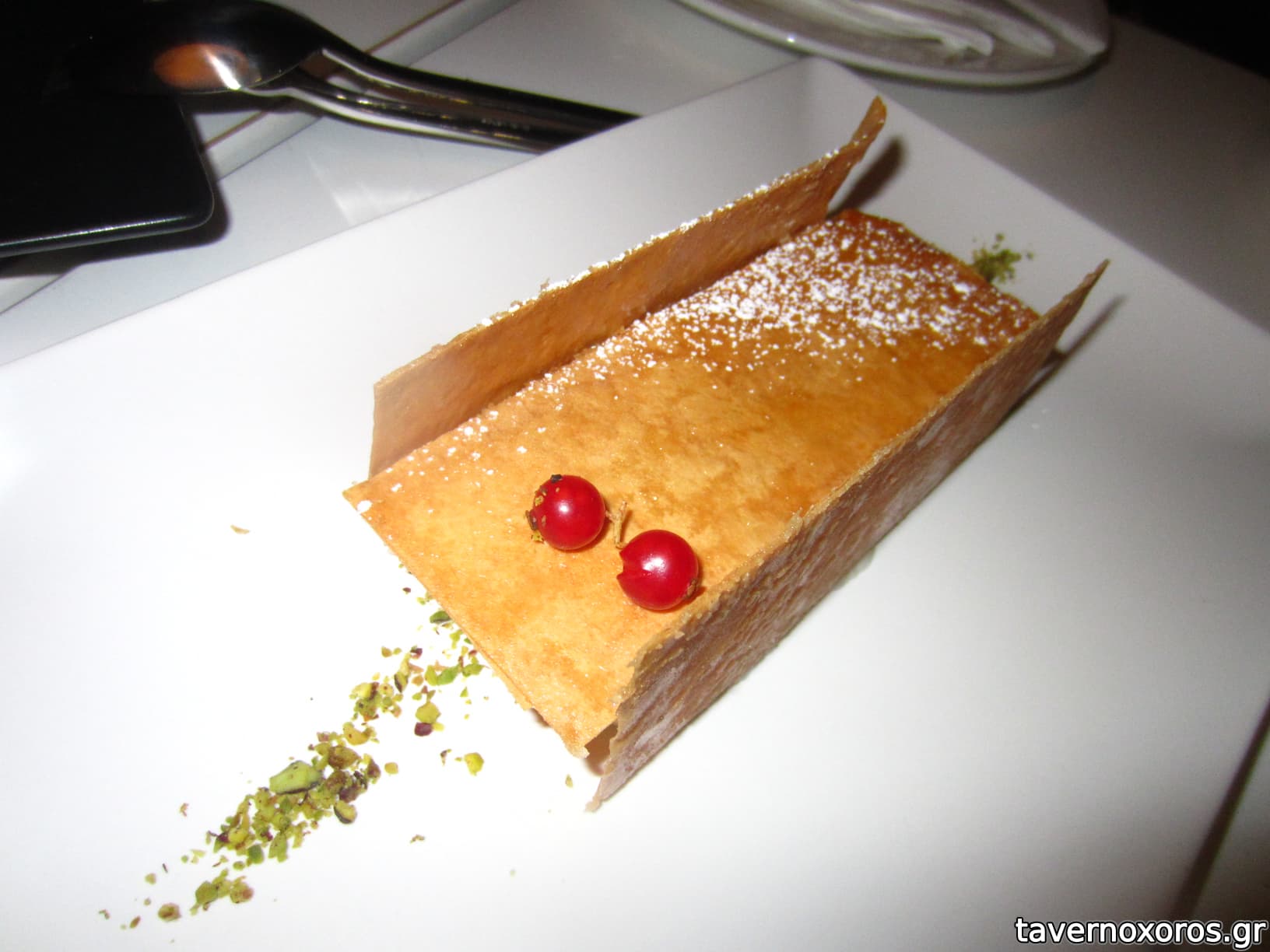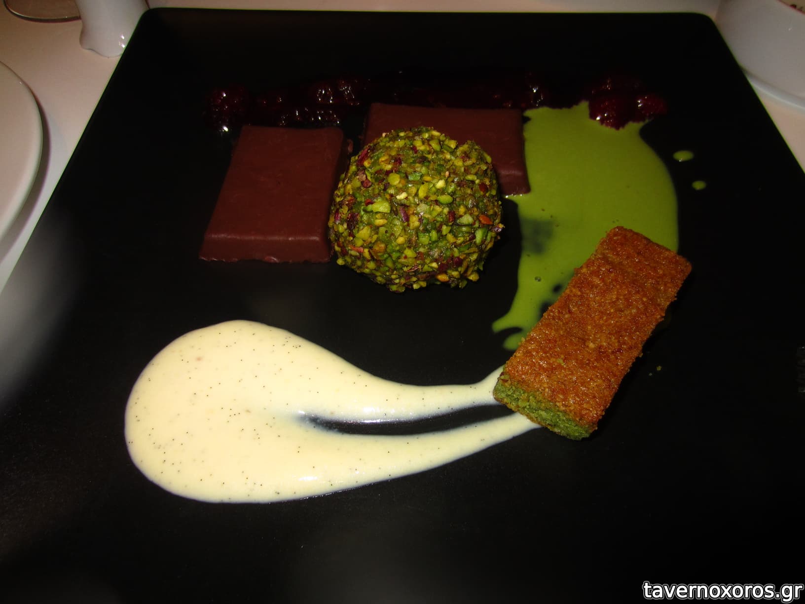 "Κρέμα σοκολάτας Caraibe Valrhona και κρέμα με φιστίκι Αιγίνης" (καταπλητικό)