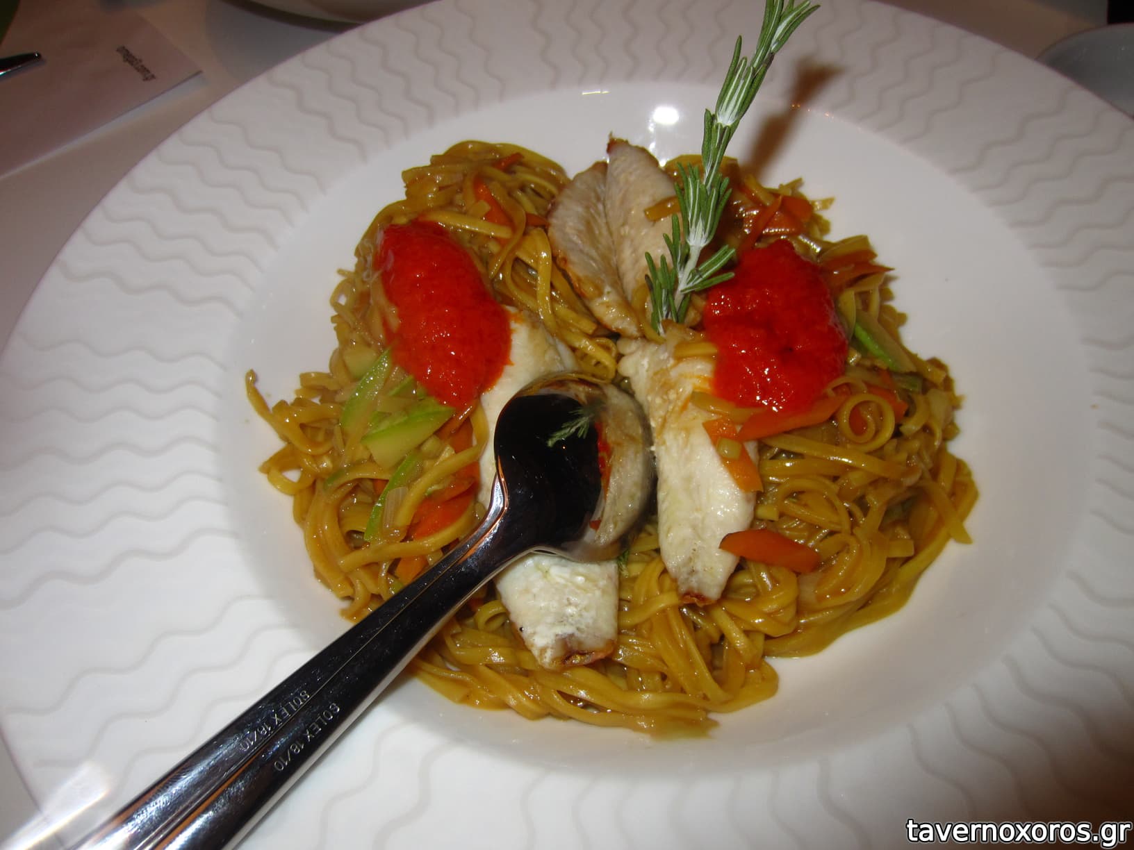 Το φιλέτο μπαρμπύνι με ζυμαρικό και σάλτσα κόκκινης πιπεριάς ήταν απλώς οκ.