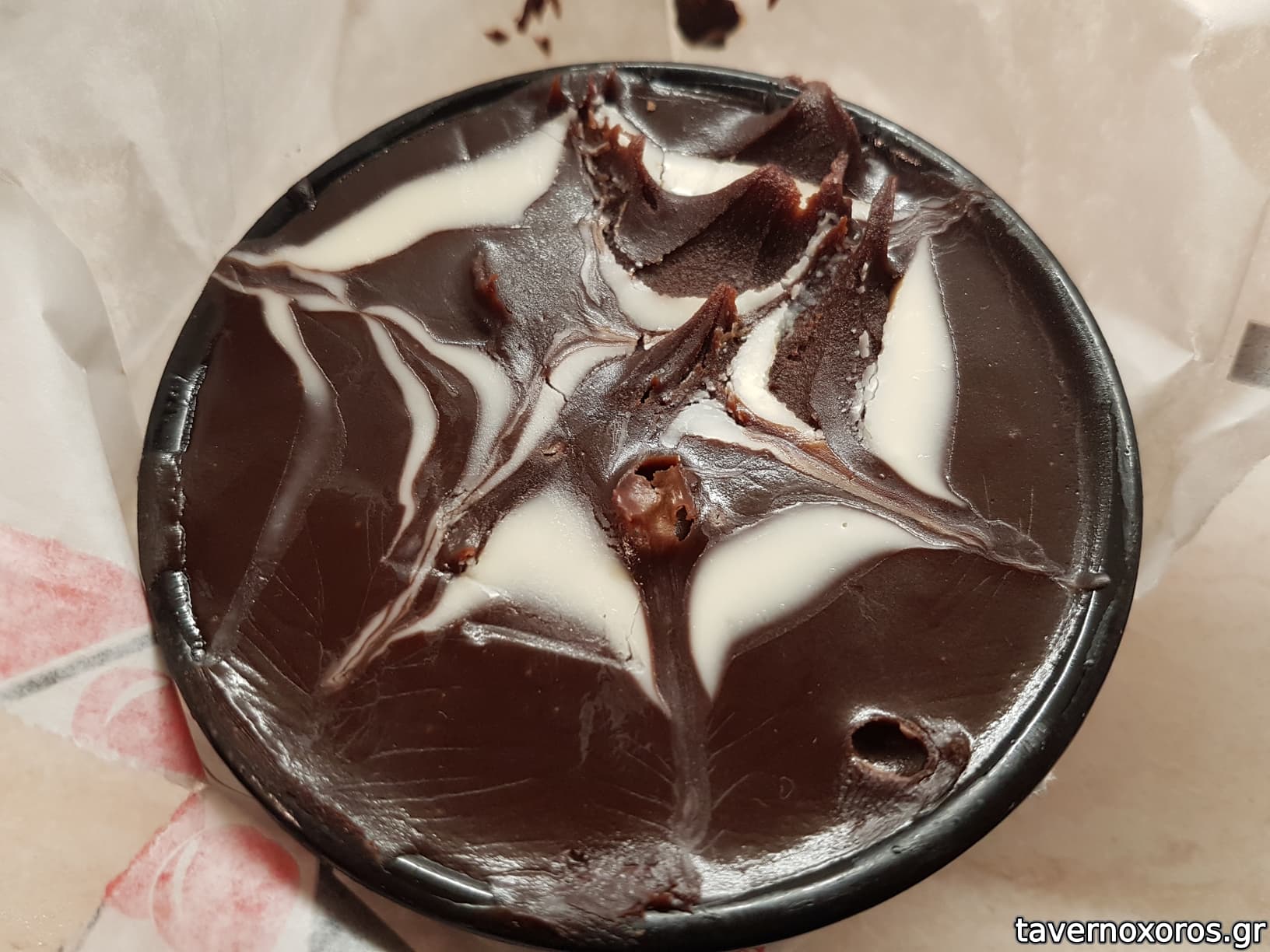 Σοκολατόπιτα από γλυκά του ταψιού. Όμοιά της δεν έχω ξαναφάει. Πιο γλυκιά από τις περισσότερες αντίστοιχες, αλλά λιγότερο λιγωτική, λόγω της προσθήκης (αν δε με απατά ο ουρανίσκος μου το λέω αυτό) λίγης καρύδας ή φοινικόλαδου, που δίνει μια παραπάνω διάσταση στα αρώματα. Δεν έχω πάρει κάτι άλλο από εκεί.
