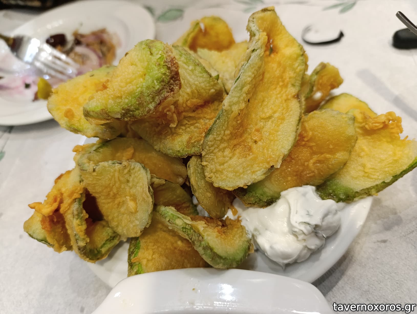 Κολοκυθάκια τηγανητά - ίσως η μόνη αποτυχία της βραδιάς, πολύ λεπτά και με παραπανίσιο λάδι