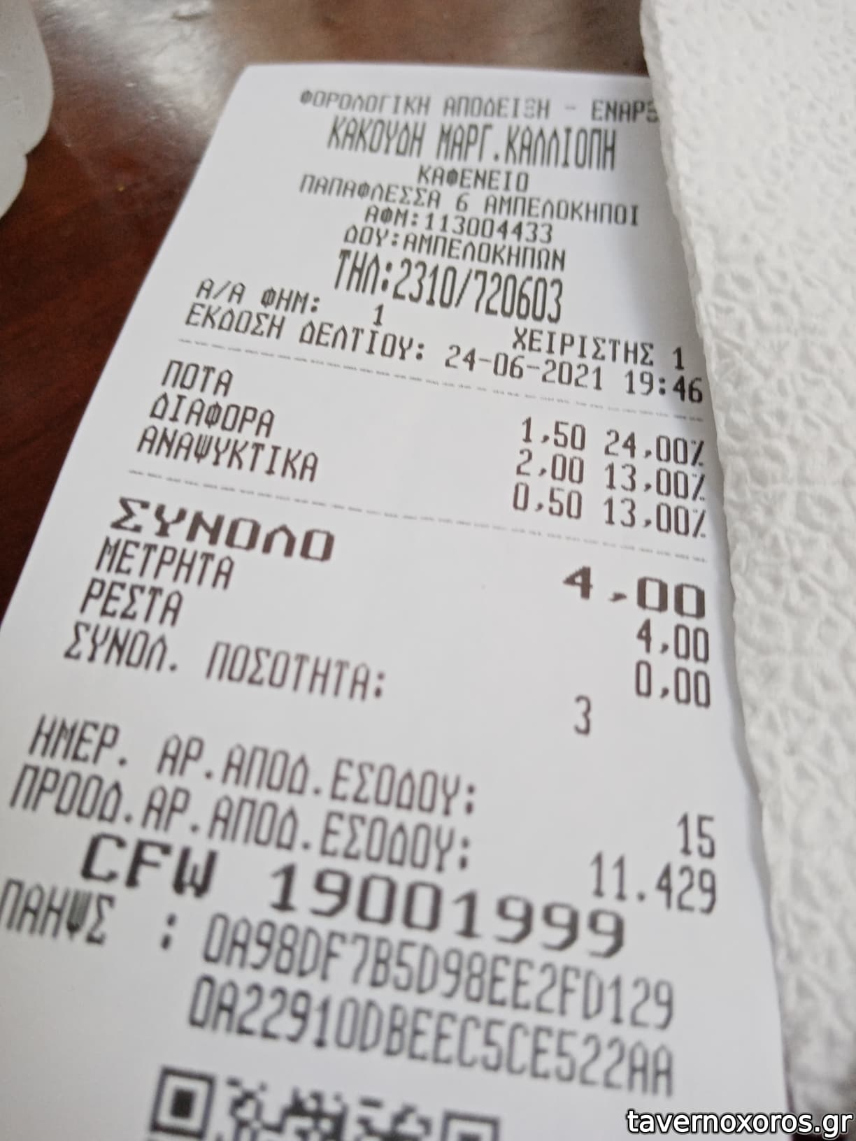 Απόδειξη (τσίπουρο μετά μεζέ και εμφιαλωμένο νερό, 4 ευρώ)