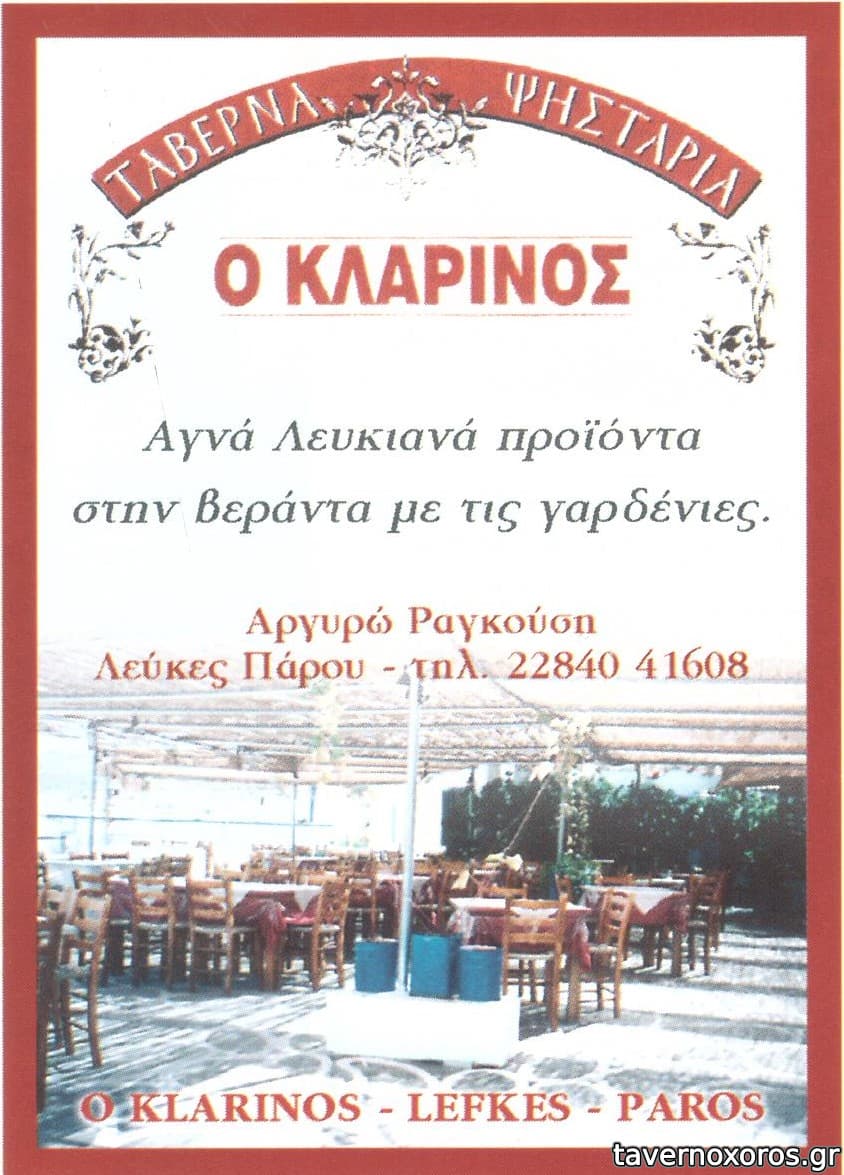 Στο πιο όμορφο χωριό της Πάρου μάλλον, με αρκετό πράσινο που ίσως δεν το περιμένεις στην Πάρο είναι η ταβέρνα Κλαρίνος. Καράβολοι (σαλιγκάρια) που είναι και το διάσημο πιάτο του μαγαζιού ήταν καλό. Κουνέλι επίσης καλό. Δεν ήταν κάτι σούπερ το φαγητό, αλλά μια επίσκεψη, ειδικά για να δείτε και το χωριό την αξίζει. Λίγη υπομονή μόνο με τις 2-3 σφήκες που θα σας έρθουν.