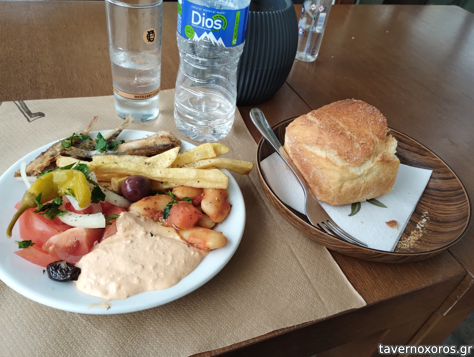 Ο μεζές πολύ καλός: γαυρακια τηγάνι πολύ καλά, μόλις είχαν βγει, γίγαντες, ντομάτα, ελιες και χτυπητη κόκκινη, πολύ καλή, και 2-3 πατάτες τηγανητες χερατες.