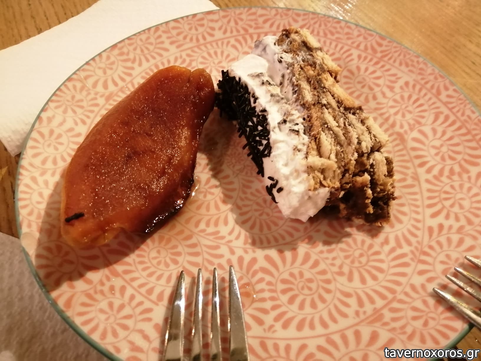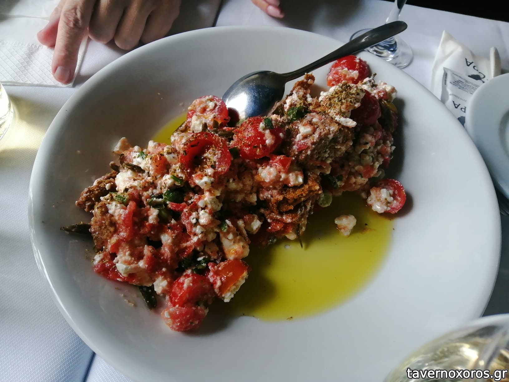 Από ορεκτικά πήραμε έναν ντάκο που κοντέψαμε να σπάσουμε τα δόντια μας με τα παξιμάδια και μία σαρμαδάκια (συστήθηκε ως σπεσιαλιτέ) τα οποία ήταν νόστιμα με μία λεπτομέρεια όμως: πριν κάποιες μέρες. Σε εμάς ήρθαν ξαναζεσταμμένα στον φούρνο μικροκυμάτων και μάλιστα τα φύλλα είχαν αρπάξει.