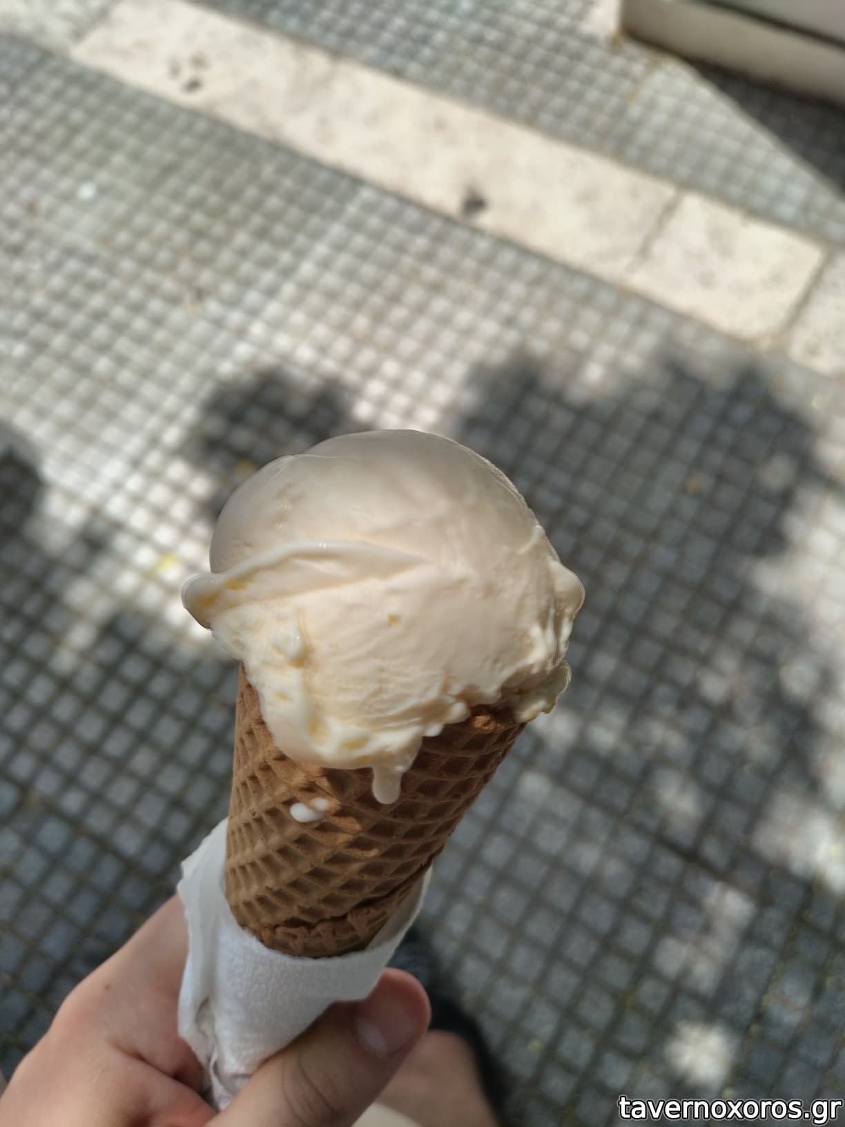 Δοκιμή σε χωνάκι μιας μπάλας παγωτού με γεύση πορτοκαλόπιτα, στα 2,