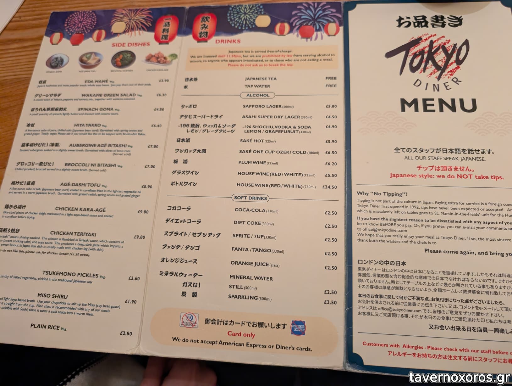 Μικρούτσικο ιαπωνικό εστιατόριο με μικρούτσικα -σχεδόν παιδικά- καθισματάκια. Το σέρβις κινέζικο στυλ, δηλαδή όχι ιδιαίτερα ευγενικό, αλλά όμως αποτελεσματικό. Το spinach goma dare πεντανόστιμο αλλά μια σταλιά (2,5 λίρες), το παλαιωμένο τοφού (5,50) είχε -κατά τη γνώμη μου από τη φύση του- απαράδεκτη υφή, ενώ τα udon noodles (7,30 λίρες) πολύ καλά. Κερασμένο τσάι από φύκια με γεύση ποδαρίλα, γενικά από τιμές πολύ καλό για τα δεδομένα του Λονδίνου.