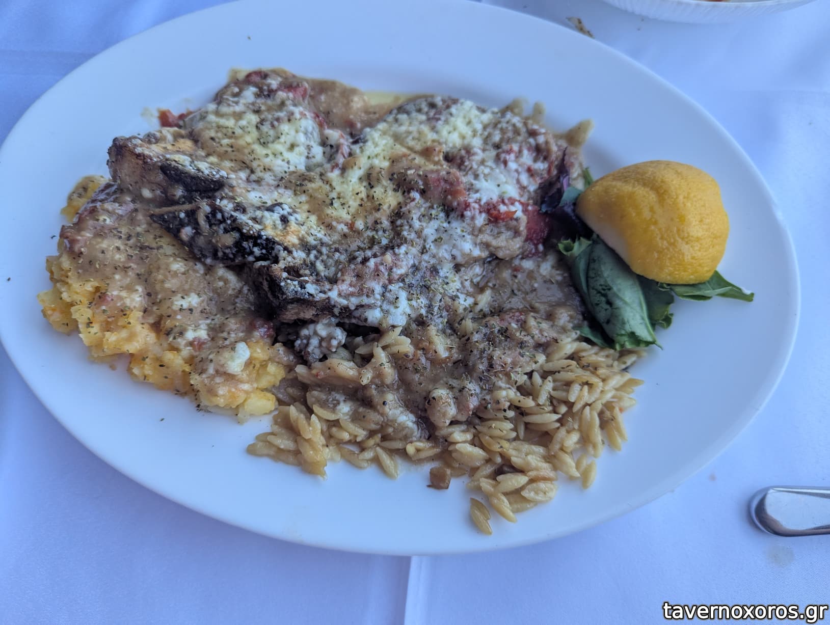 Σπαλομπριζόλα φούρνου , καλή . Μου φάνηκε λίγο βαριά με τόσο λιωμένο κασέρι αλλά είχε ωραία συνοδευτικά , κριθαράκι με μανιτάρια τρομερό και πουρέ πατάτας.
