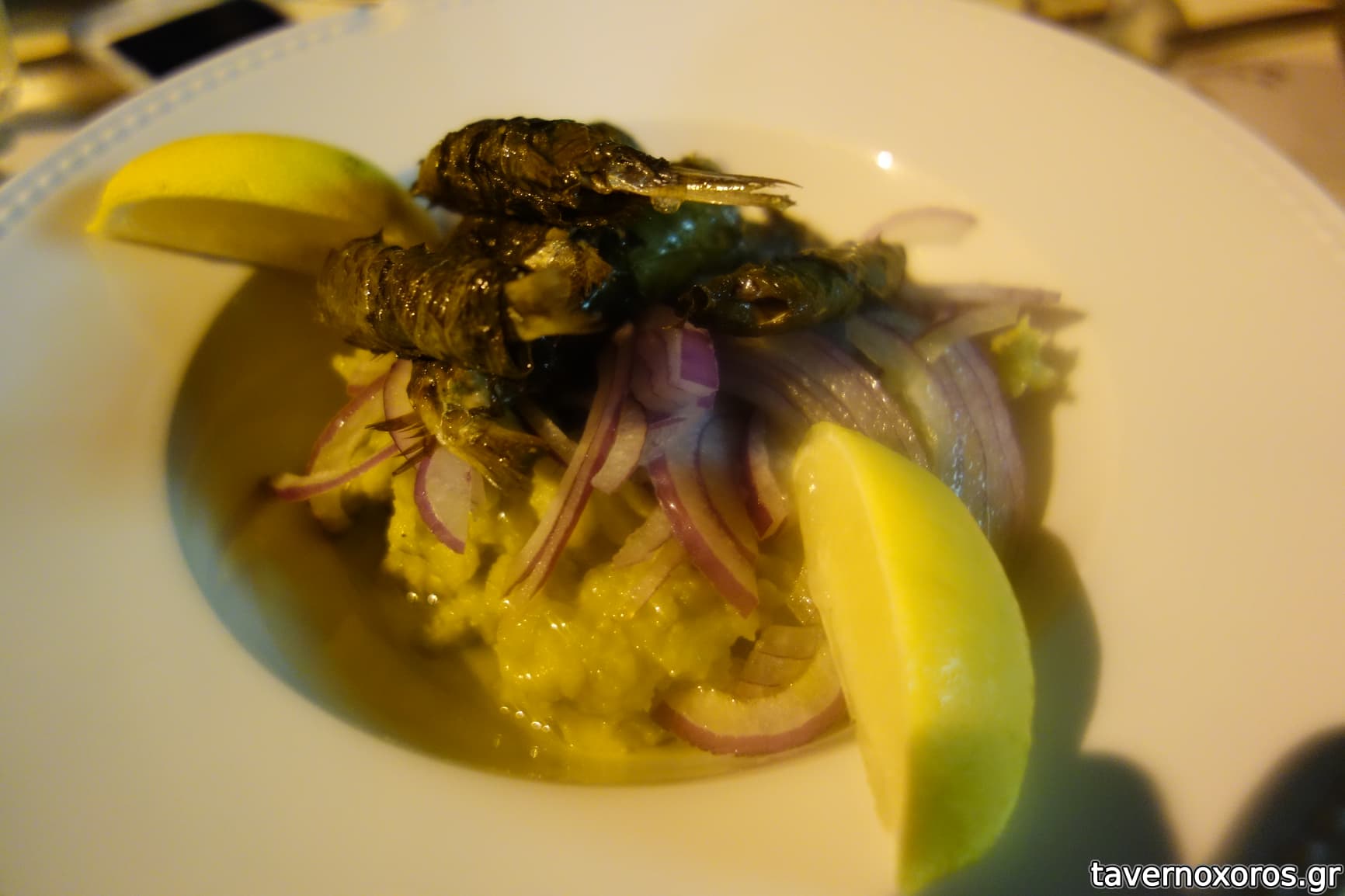 "Σαρδέλα στο αμπελόφυλλο με μπιζελόφαβα" (πολύ κακό, η φάβα καλή)