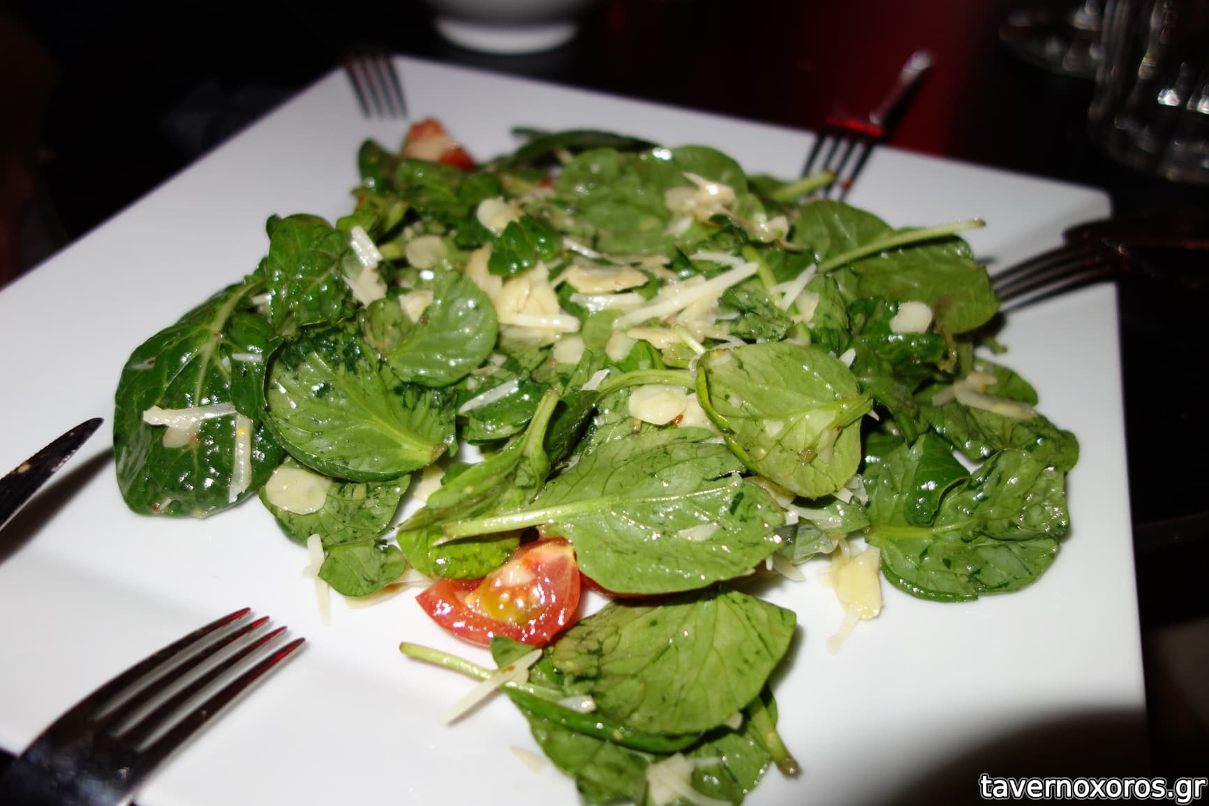"Σαλάτα με baby σπανάκι και ρόκα, φλοίδες παρμεζάνας, ψητά ντοματίνια, και βινεγκρέτ λεμόνι με μουστάρδα Dijon" (αδιάφορη)