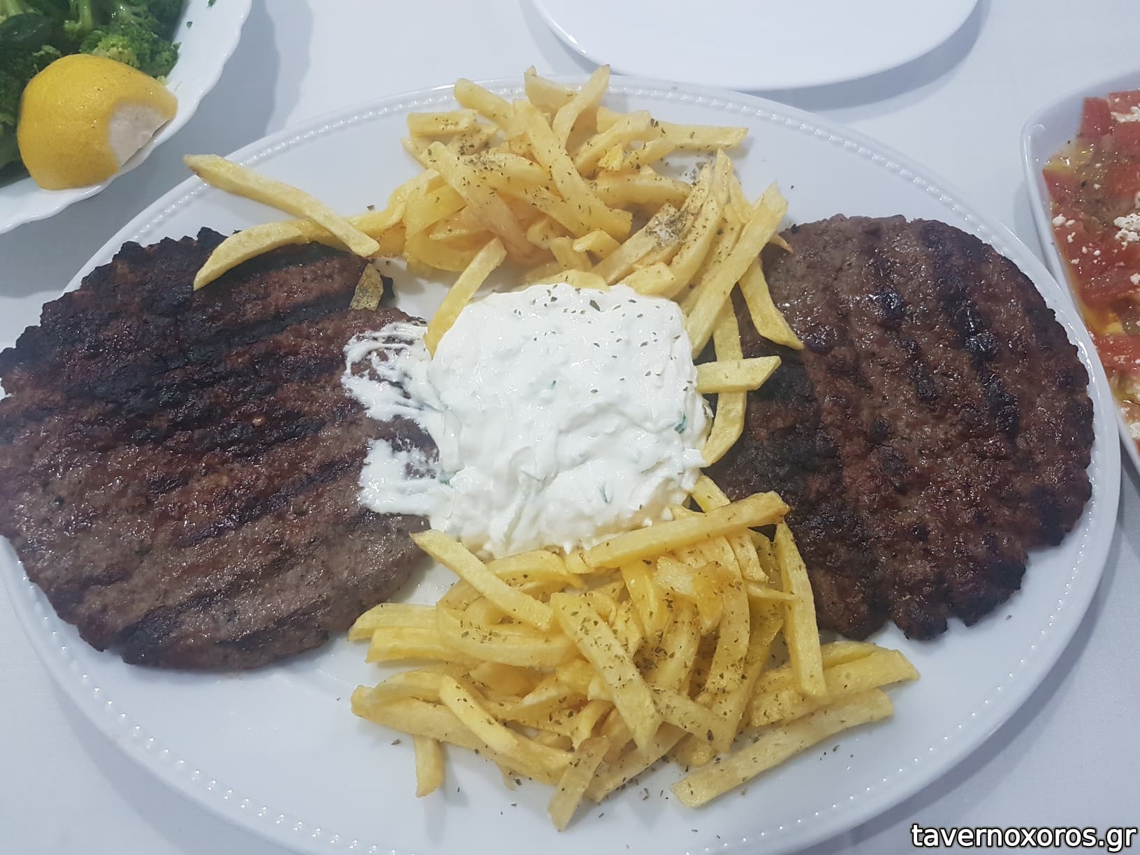 Μπιφτέκια (τα μπιφτέκια μετριοκαλά, οι πατάτες καλές, το τζατζίκι καλό αλλά με πολύ σκόρδο)