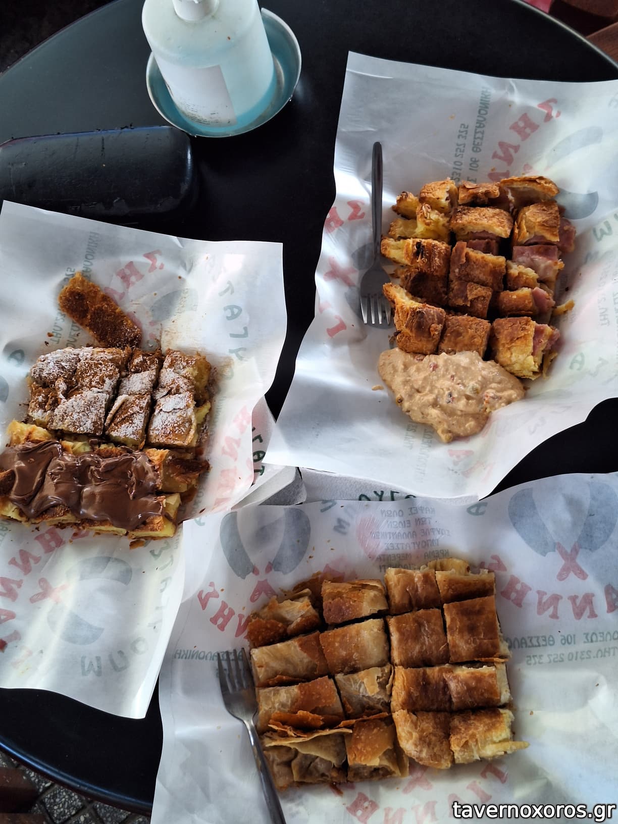 Με ωρολογιακή φορά: σουφλέ αλλαντικών με κοπανιστή, μπουγάτσα κιμά και μπουγάτσα κρέμα (η μισή με μερεντα, η άλλη μισή με άχνη-κανέλλα)