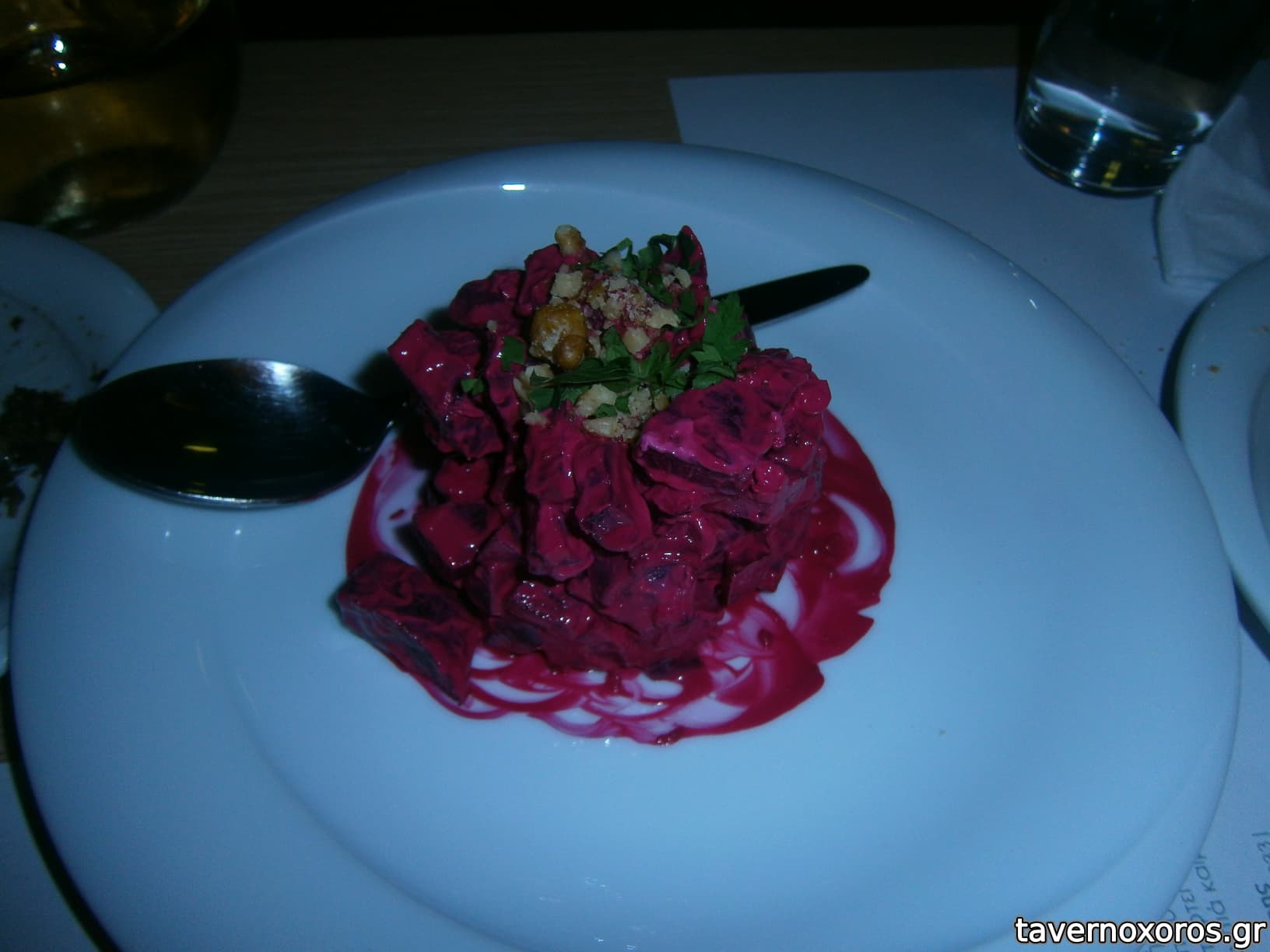 - πατζαροσαλάτα: τραγανό πατζάρι, ιδιαίτερη γεύση λόγω τζίντζερ, μικρή ποσότητα