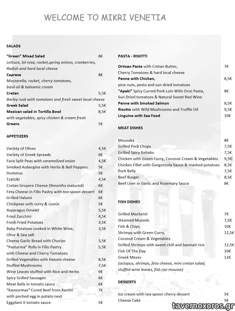 Ένα μαγαζί που φτιάχτηκε με μεράκι και άποψη: Στην υποδοχή η Βενετία (χαλαρή και παρεϊστικη, κάθησε μαζί μας, τα ήπιαμε και τα είπαμε), στην κουζίνα η Φλωρεντία (όχι, δεν είναι χιούμορ!)και στο σέρβις η Αναστασία(με τσαχπινιά).Και ο εσωτερικός χώρος είναι ευχάριστος και τα εξωτερικά τραπεζάκια ακόμη περισσότερο.Ο κατάλογος είναι μικρός και διαφοροποιείται ανάολογα με την εποχή.