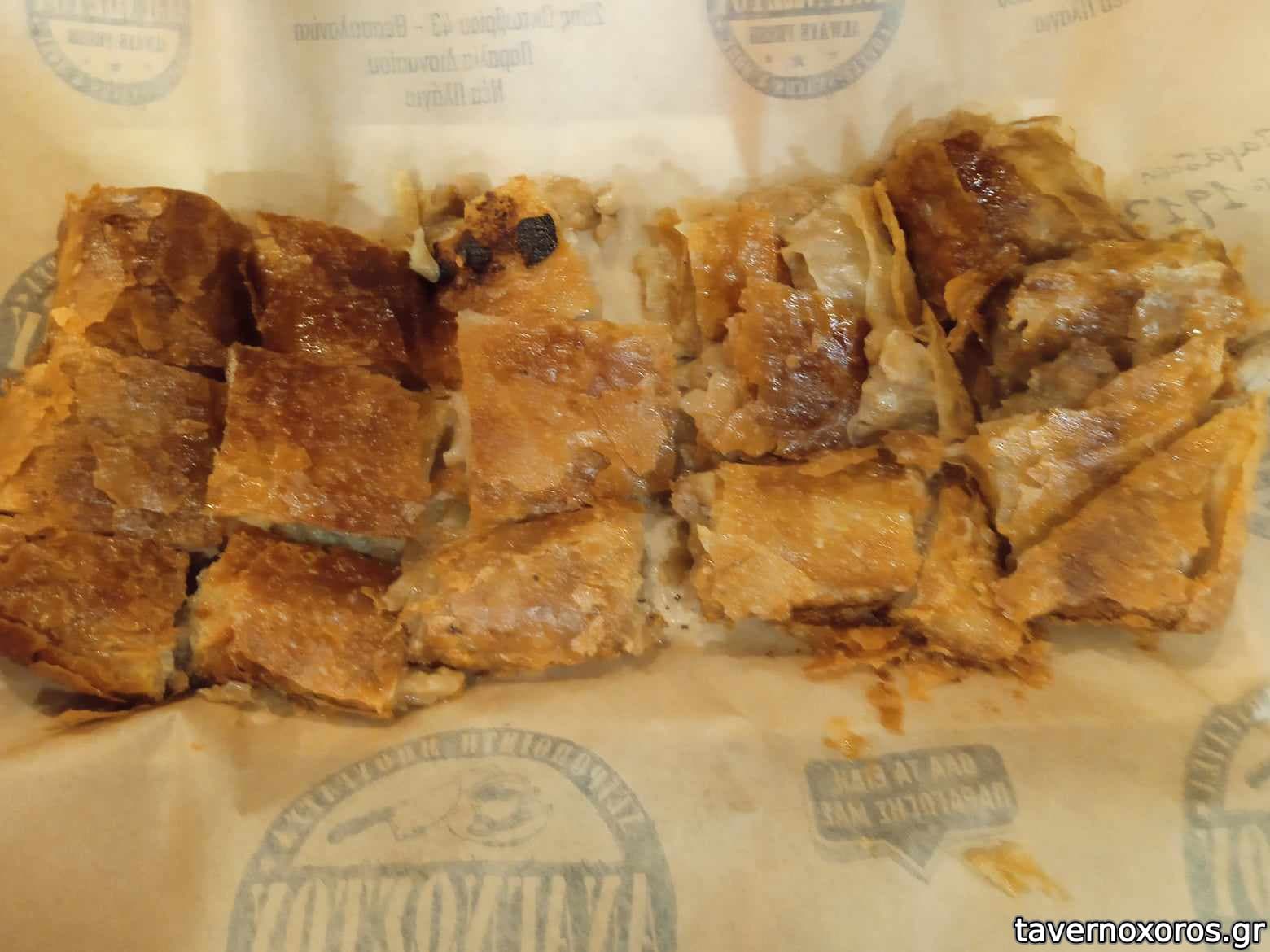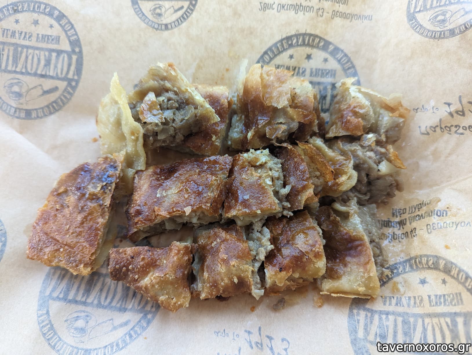 Η μπουγάτσα με κιμά εξίσου καλή, με μπόλικο κρεμμυδάκι μέσα να δίνει γλύκα και να σπάει την κρεατίλα.