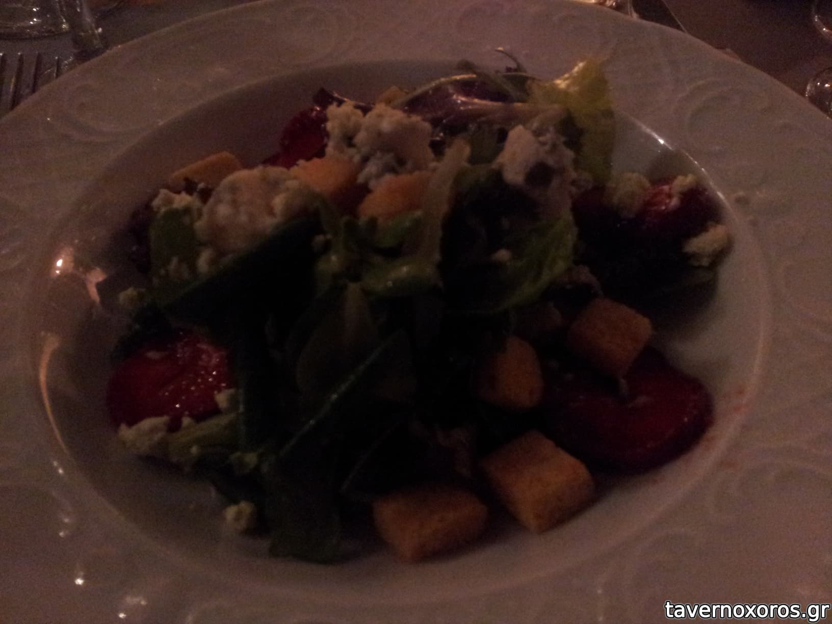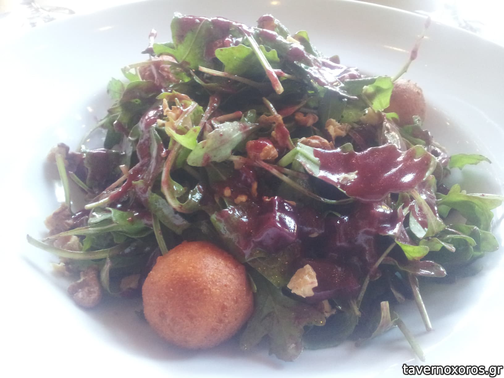 Ρόκα με παντζάρι, καρύδια, κατσικίσιο τυρί και βινεγκρέτ από μούρα