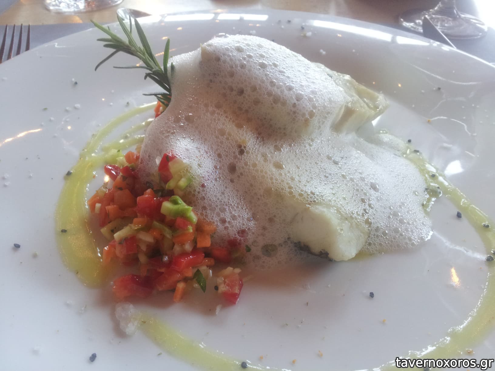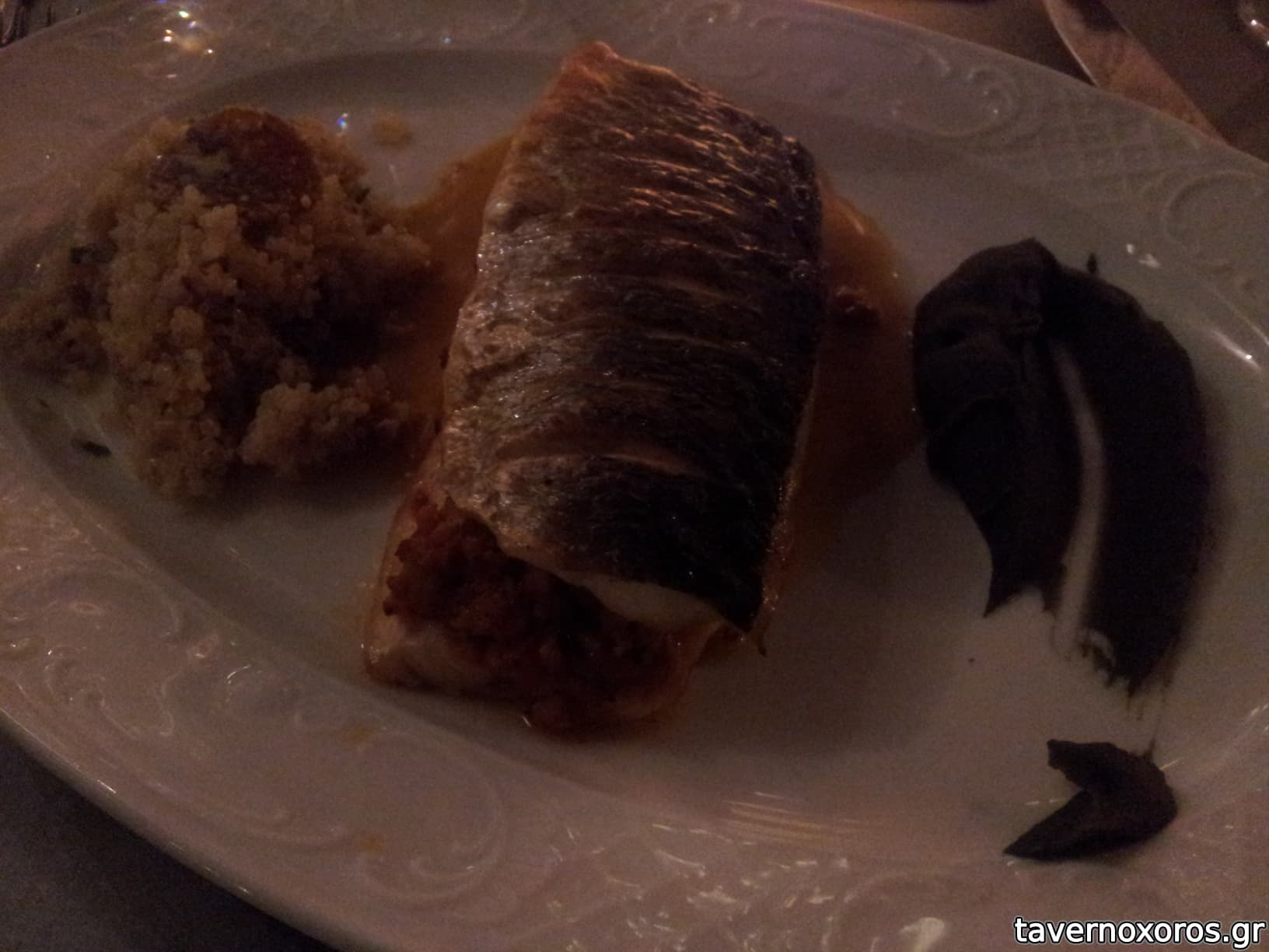 Λαβράκι γεμιστό με καλαμάρι κινόα με συκομαΐδα και σαμπαγιόν εσπεριδοειδών