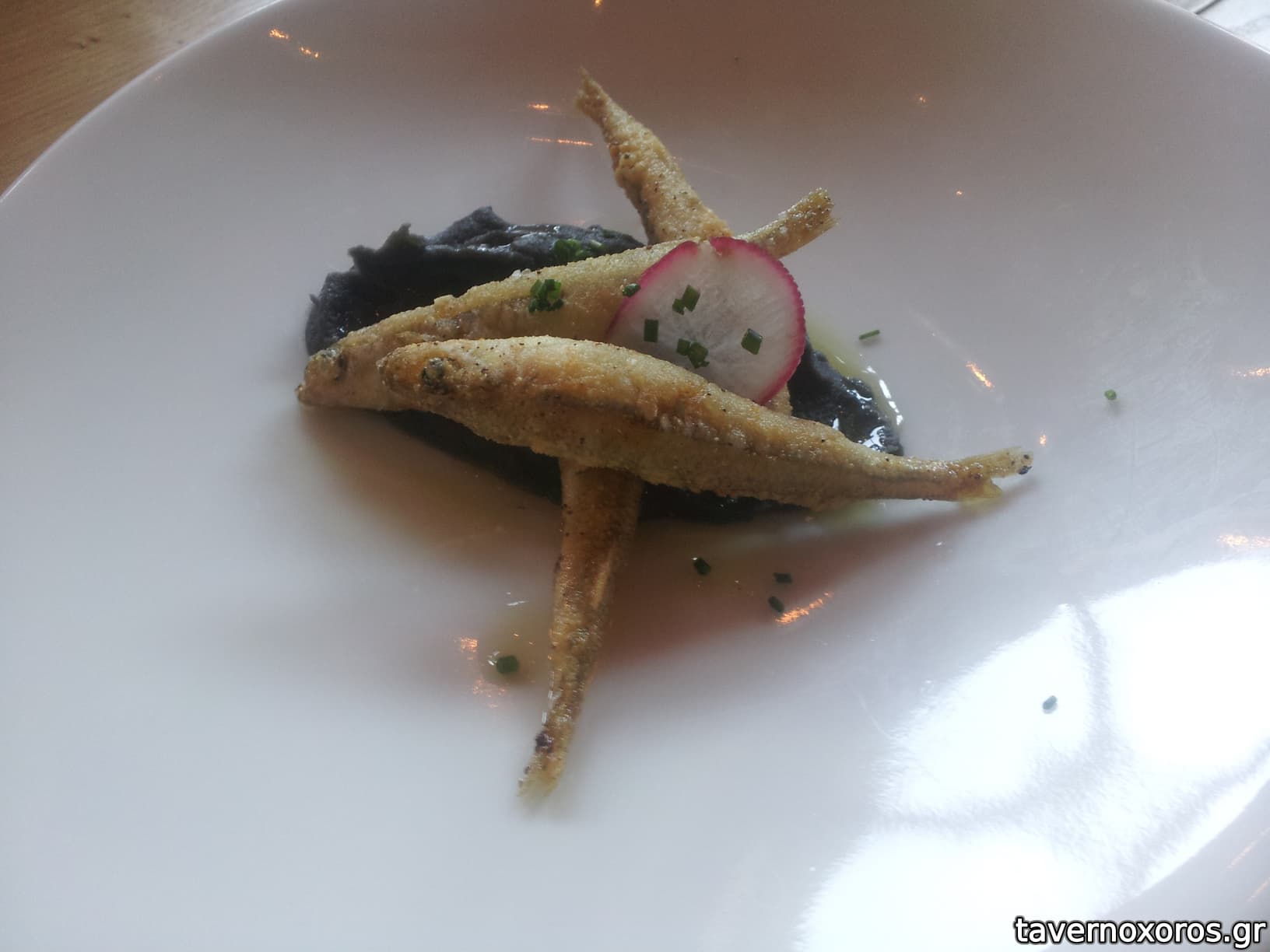 Καλωσόρισμα: τηγανητή μαρίδα σε ταραμά με μελάνι σουπιάς