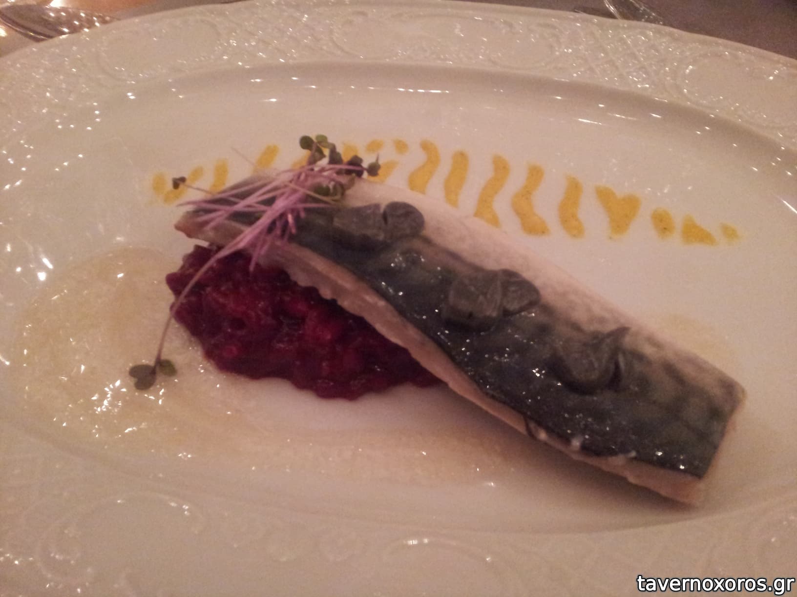 "Το σκουμπρί σε αποσύνθεση" σιγοψημένο σε κενό αέρος, με ριζότο παντζάρι με σάλτσα βανίλιας-σαφράν και essence από το δέρμα του