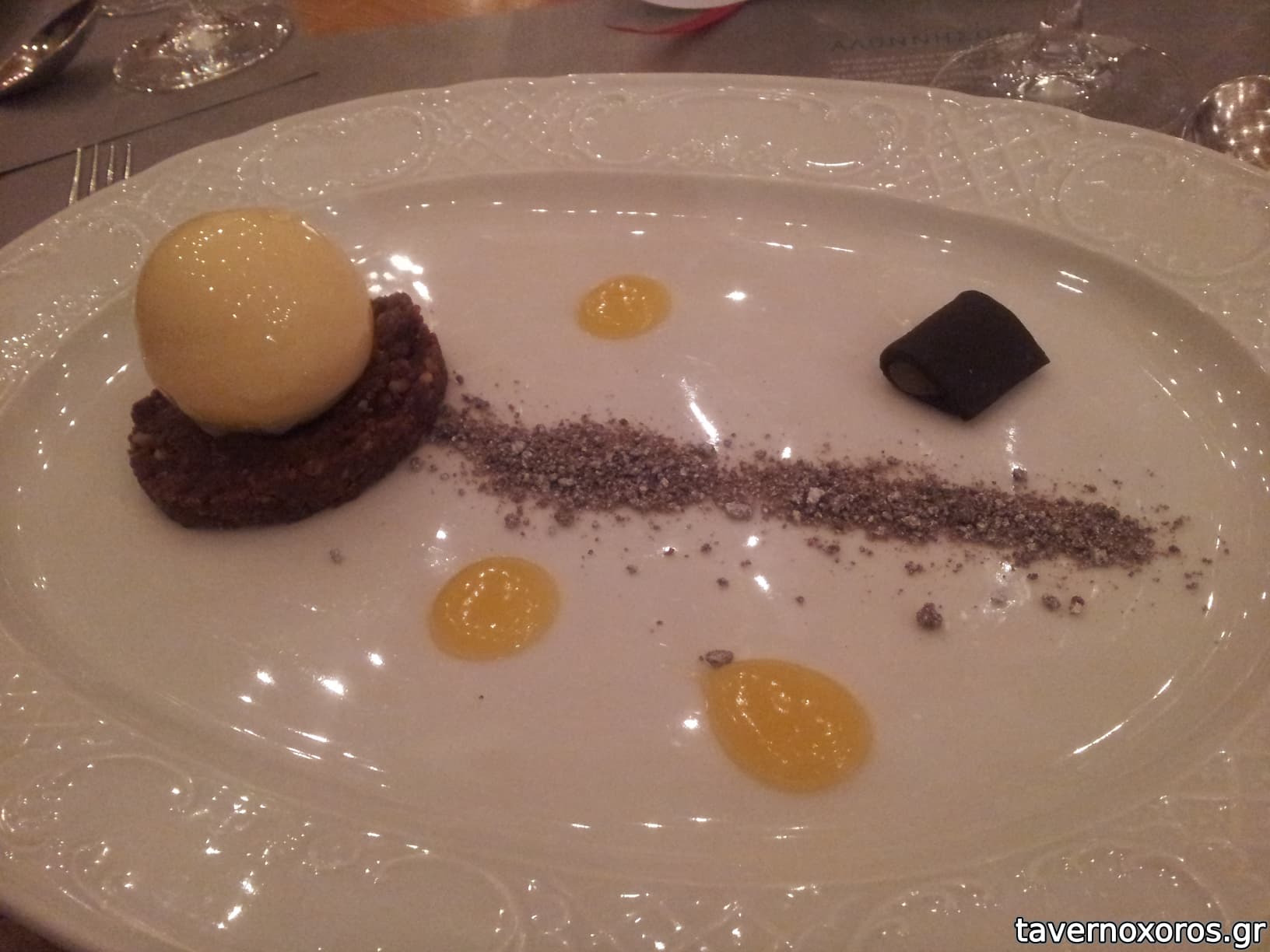 "Η πανσέληνος" μανταρίνι, brownie θρυμματισμένο και γλυκιά ζύμη από σκόρδο