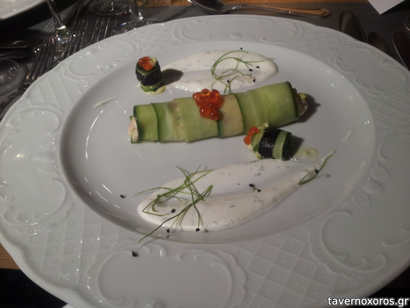 Γαρίδα ταρτάρ σε παπαρδέλες αγγουριού με σάλτσα γιαουρτιού με λεμόνι και χαβιάρι σολομού