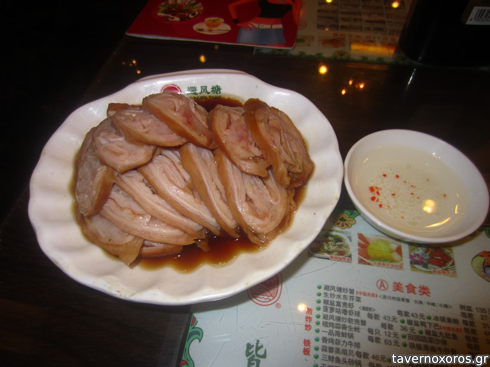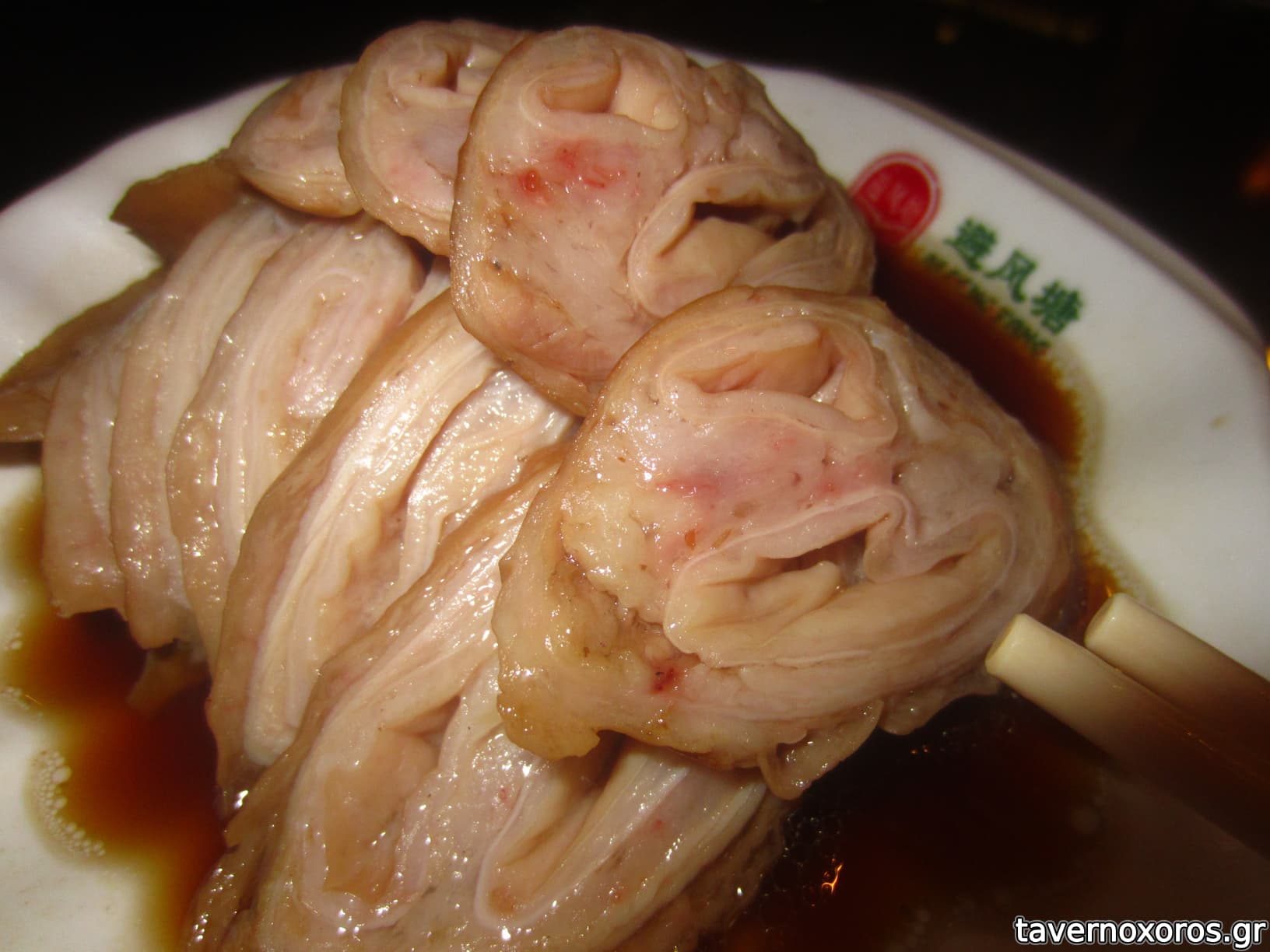 "Pig's intestine marinated with Teochew spice sauce" (πολύ ζόρικο, αλλά θύμιζε κάτι από πατσά οπότε το πάλεψα)