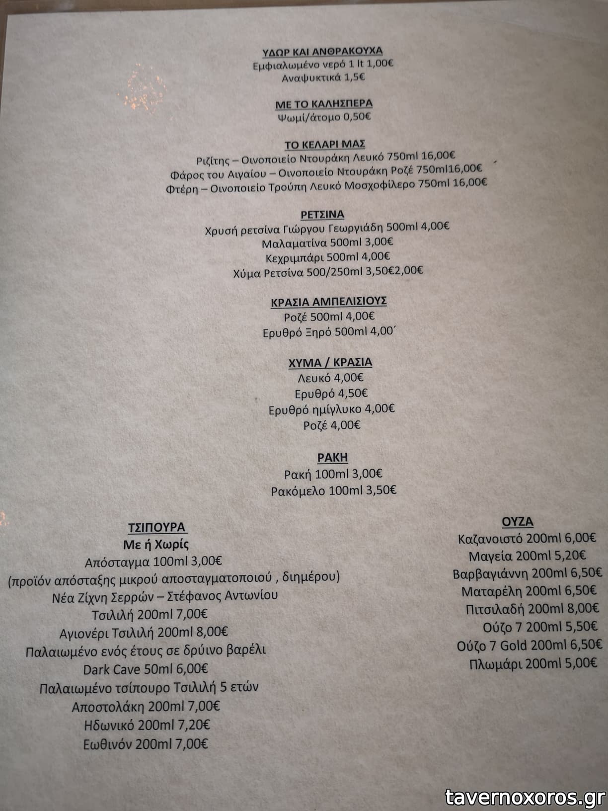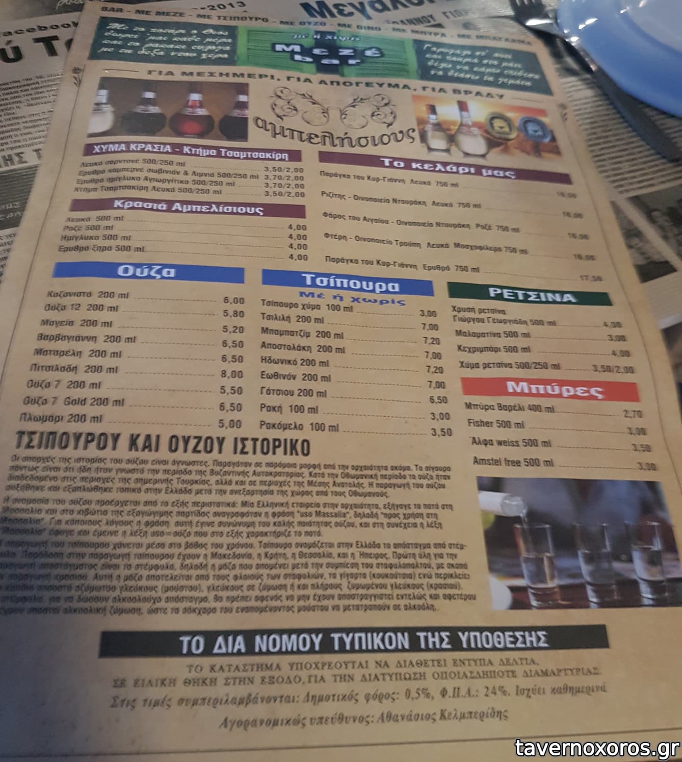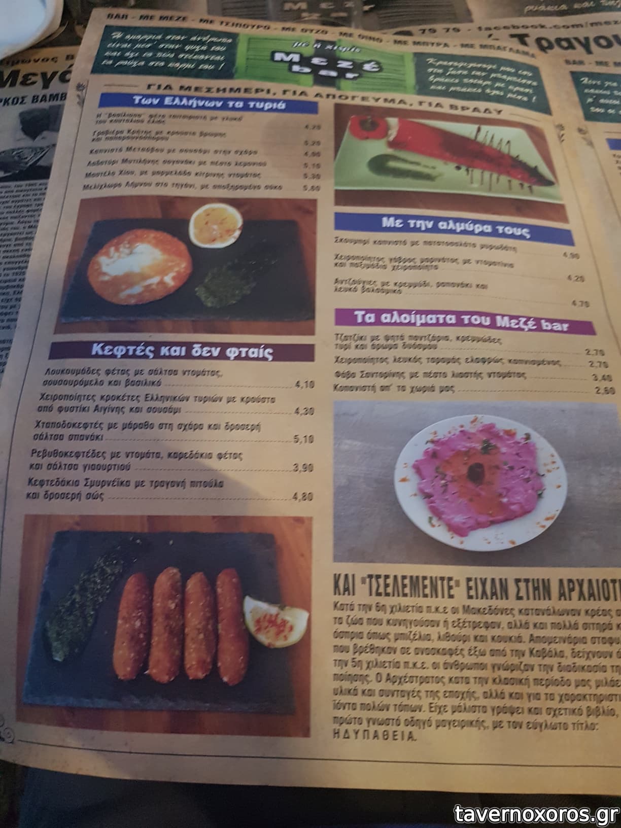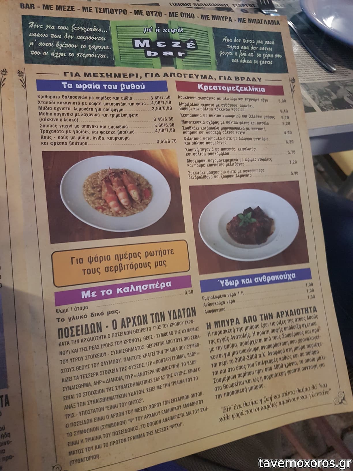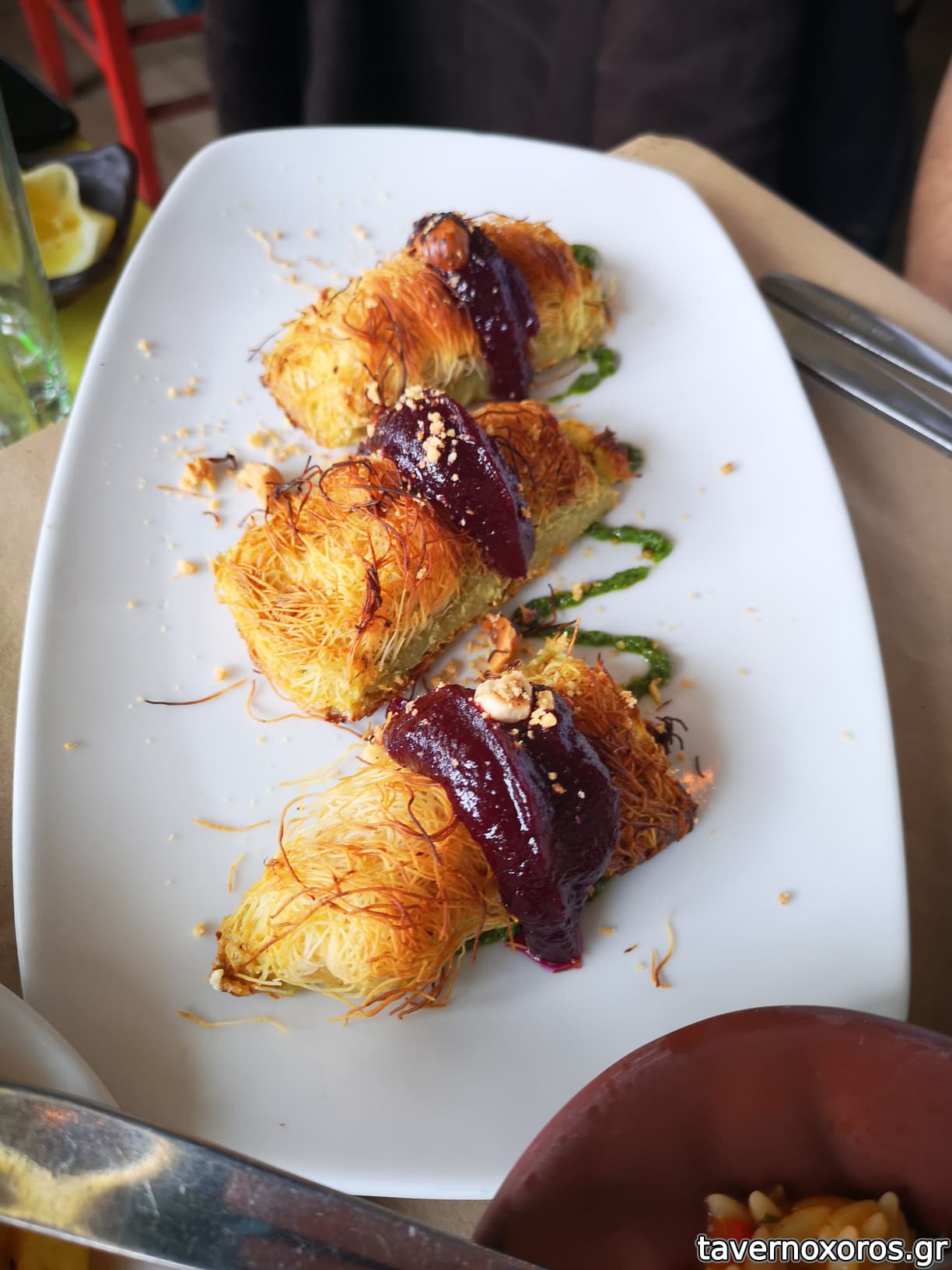 Το κανταίφι τυριών με το μέλι πολύ καλό, το ίδιο και η παντζαροσαλάτα με τη φέτα (ροζ αλοιφή), οι σουπιές με το σπανάκι εξαιρετικές, τηγανιτή γάπαρη πολύ φρέσκια, το ίδιο και το μυδοπίλαφο. Οι πατάτες γίγας με τη σος τυριών επίσης πολύ καλές. Το σέρβις φιλότιμο μιας και είχε πολύ κόσμο, το τσιπουράκι αρκετά καλό. Τιμές λίγο υψηλές για την ποσότητα του φαγητού.