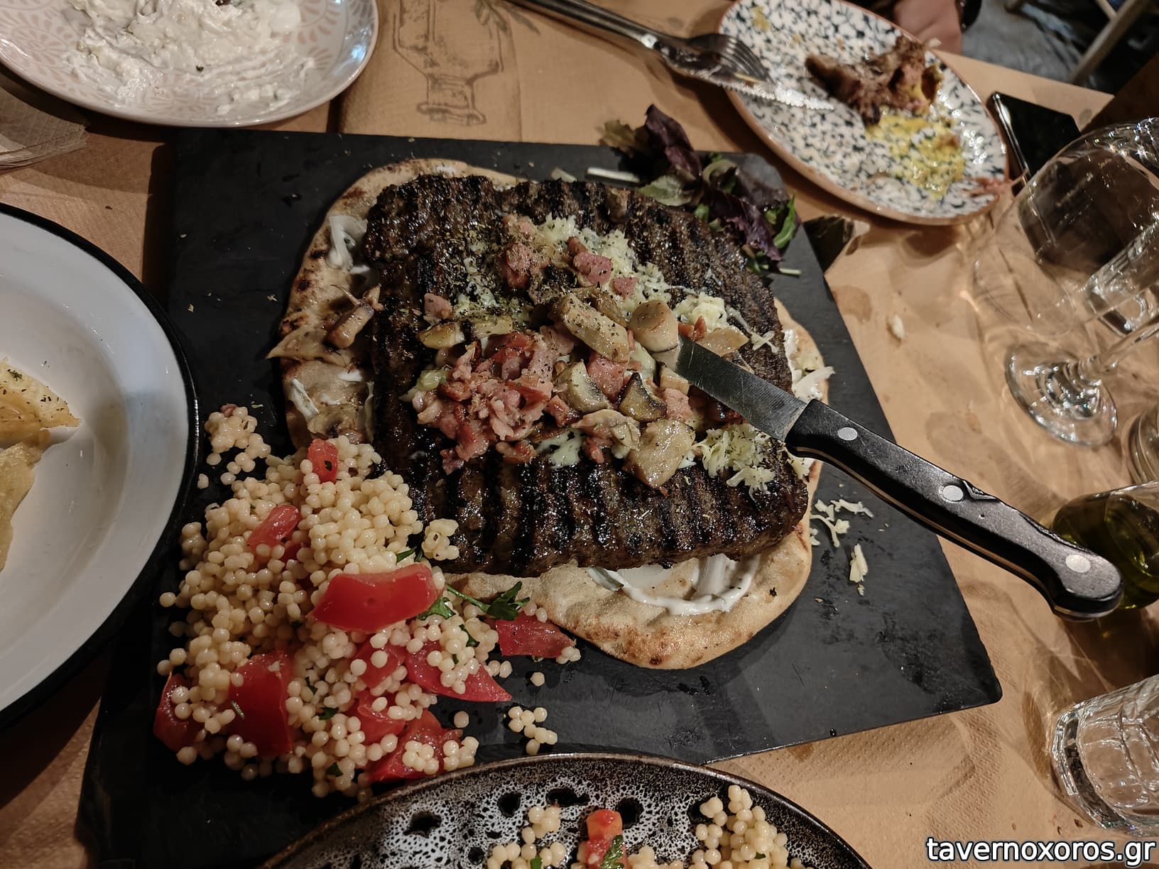 Η σπεσιαλιτέ του μαγαζιού, τετράγωνο μπιφτέκι γιγαντιαίων διαστάσεων (όντως ζουμερό και πολύ νόστιμο, αξίζει)