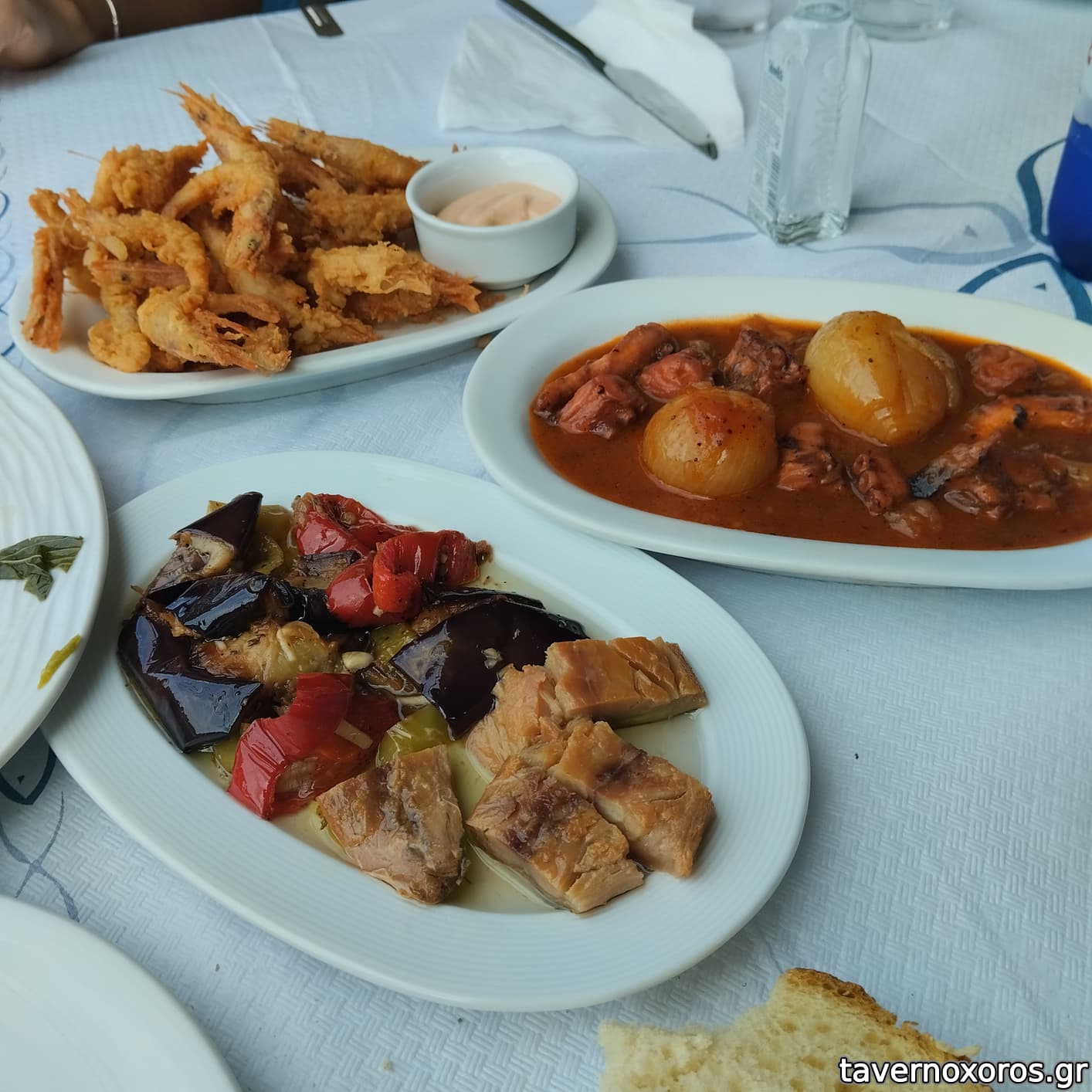 Χταπόδι στιφάδο, λακέρδα με μελιτζανάκι τουρσί, γαριδάκι τηγανιτό για τα πρώτα δύο τσίπουρα.