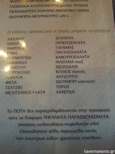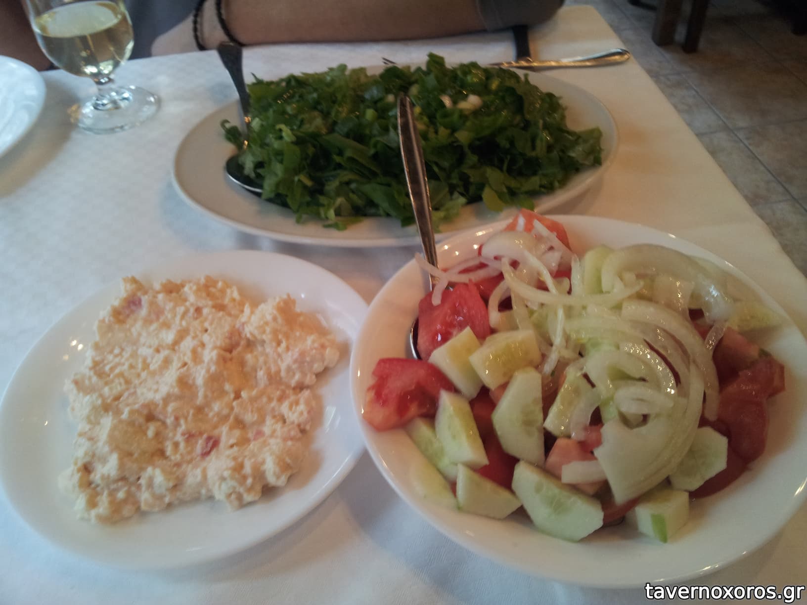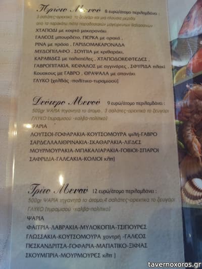 3 άτομα μισό κιλό γαύρος(ολόφρεσκος), μισό κιλό γαλέος (κτψ φυσικά αλλά ωραίος) , μισό κιλό μπακαλιαράκια(φρέσκα) 1 τυροσαλάτα(δικιά του με γιαούρτι, respect), 1 σκορδαλιά (power και με καρύδι), 1 ρόκα μαρούλι, 1 λακέρδα (ωραία, μισό κιλό χύμα ρετσίνα ψωμί νερό 42Ε. Αν ήμουν στον γιαλό θα είχα δώσει 70Ε μόνο για τα ψάρια.