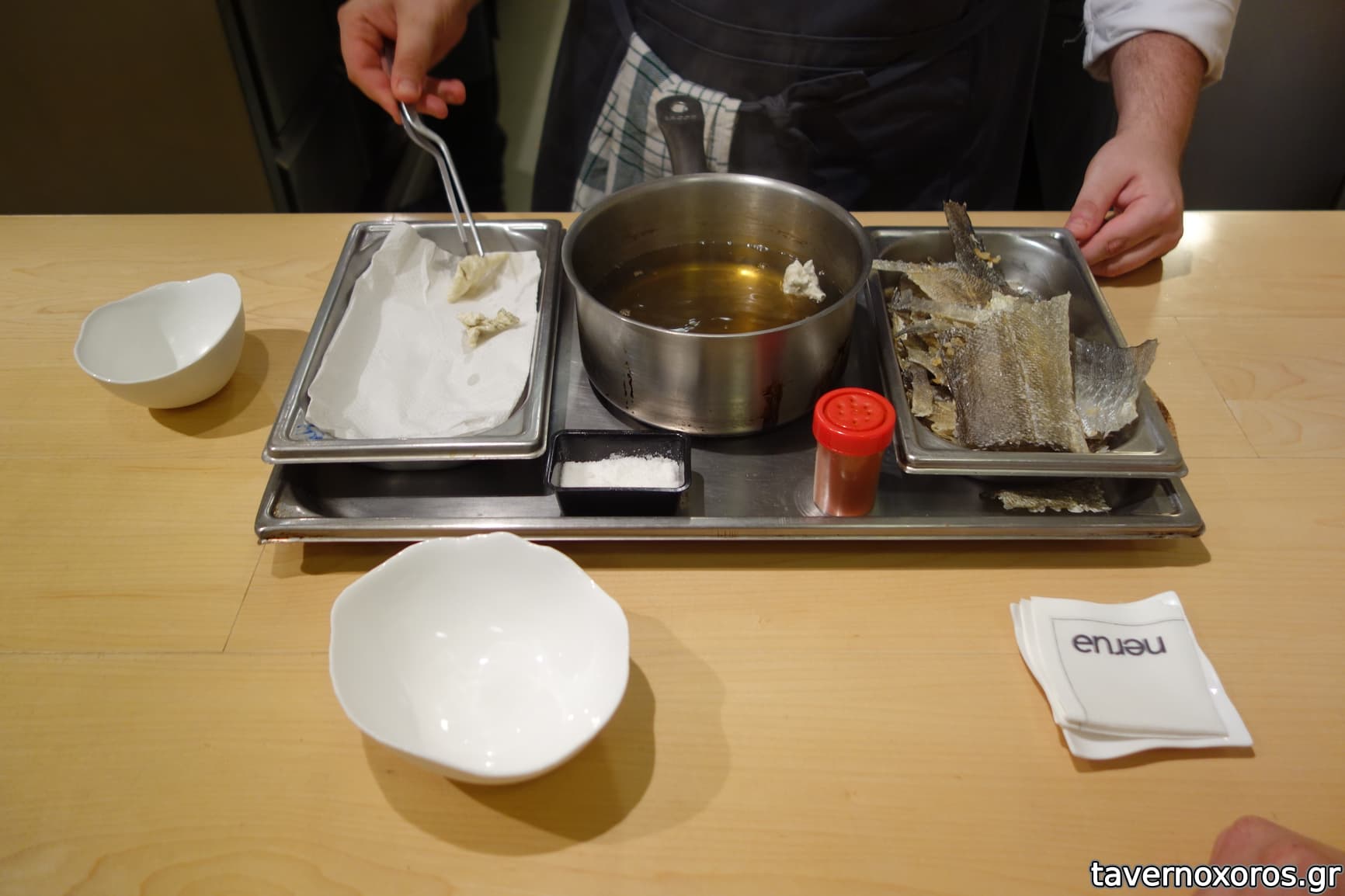 9 products" μαζί με το αντίστοιχο πακέτο wine tasting. Σύνολο από όλα τα πιάτα που δοκίμασα 1 παρανοϊκό (" duck foie gras"), 2 εξαιρετικά (" Iberian pig' s tails" & " tomatoes in sauce"), 2 πολύ καλά (" anchovies", " crab"), 5 απλώς καλά (" fried hake", " tuna belly", " cow tenderloin", " white turnip" & " roasted aubergine") και τα 4 γλυκά ήταν οκ αλλά όχι στο ίδιο επίπεδο με τα υπόλοιπα (" pure chocolate", " grilled early fig", " apple", " strawberry"). Στο σύνολο η αναλογία εξαιρετικών πιάτων ήταν πολύ καλή και δεν είχε ούτε ένα κακό στο σύνολο των 14 διαφορετικών πιάτων. Τα αντίστοιχα ποτά που συνόδευαν το κάθε πιάτο ταίριαζαν άψογα. Από ποσότητα σκάσαμε στο φαγητό σε βαθμό αηδίας και ψιλομεθύσαμε, το 6 products menu θα ήταν πολύ πιο συνετό! - Βγήκε 140€/άτομο.