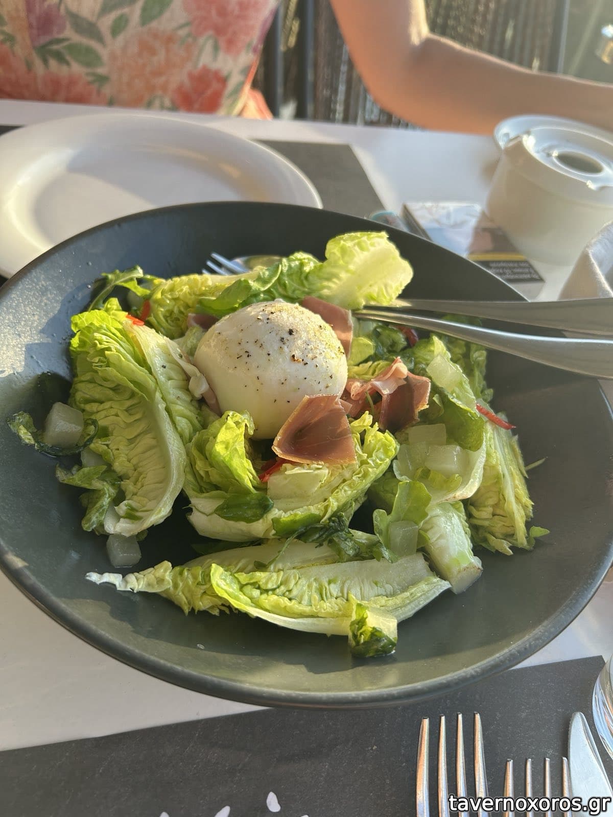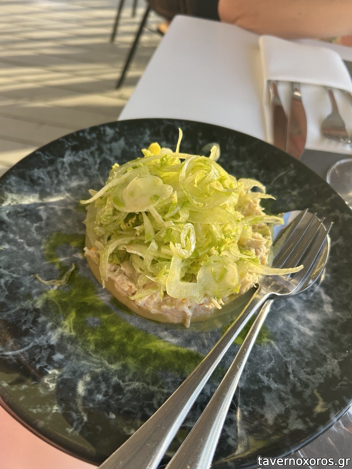 Καθίσαμε κι εμείς, Σάββατο 12/7/25, για να απολαύσουμε το ηλιοβασίλεμα. Μαζί με αυτό, απολαύσαμε κι ένα λαβράκι φρικασέ (27.00€), μια γαριδομακαρονάδα (24.00€), μια burrata (19.00€), ένα τιραμισού "ελληνικού καφέ" (15.00€) και μια φιάλη Ρομπόλα San Gerasimo (40.00€), συνολικά με νερά-καλωσόρισμα (ψωμί, λάδι και πάστα ελιάς) στα 138.00€ (αυτό δεν το απολαύσαμε ιδιαίτερα!). Σε όλα τα πιάτα φαίνονται στοιχεία ή έστω προσπάθειες δημιουργικής κουζίνας (π.χ. αφρός αυγολέμονο στο φρικασέ ή πίκλες πεπονιού στη σαλάτα), και πιθανόν οι σεφ Κουτσόπουλος, Κοντιζάς και Ιωαννίδης θα εντόπιζαν λεπτές ατέλειες, εγώ πάντως δεν είχα κανένα παράπονο, και, συνυπολογίζοντας την μαγική τοποθεσία, καθώς και τα ικανοποιητικότατα μεγέθη στις μερίδες, θεωρώ money well spent. Αν αντέχει το πορτοφόλι σας, να πάτε, οπωσδήποτε με κράτηση.
