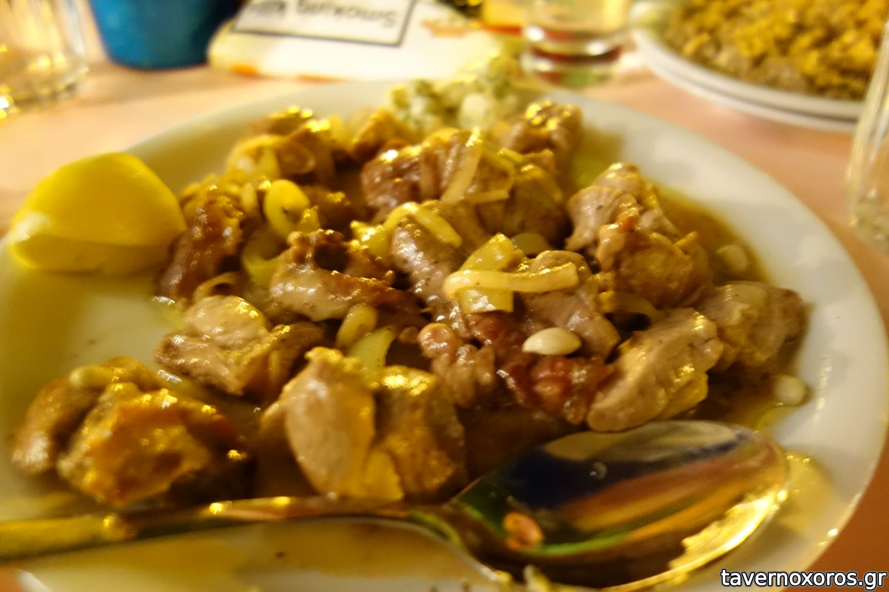 Τηγανιά χοιρινή με κρεμμύδια σκληρή. Αν ήμασταν μικρή παρέα θα την γύριζα πίσω..