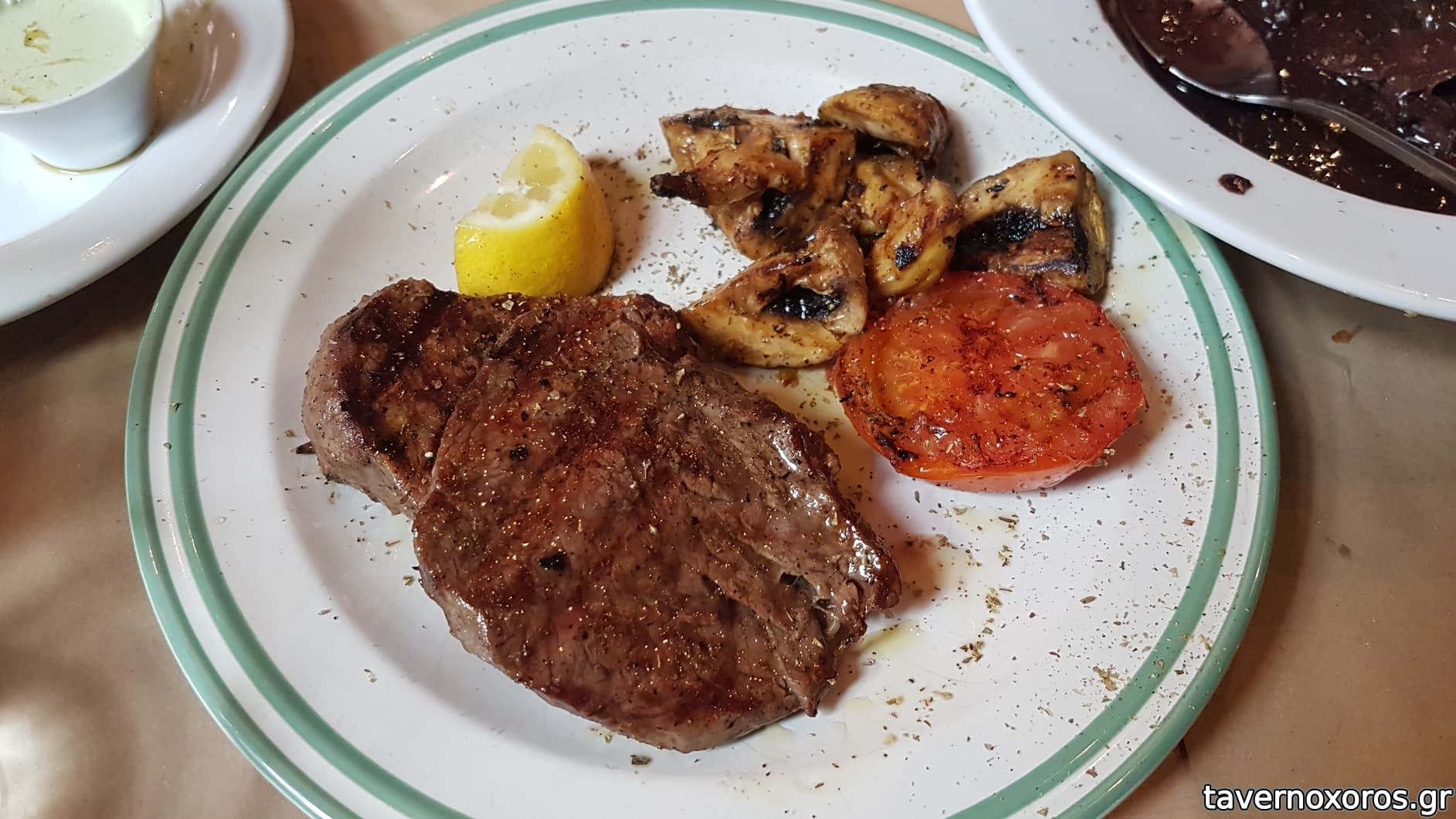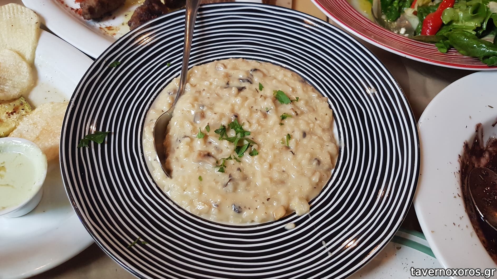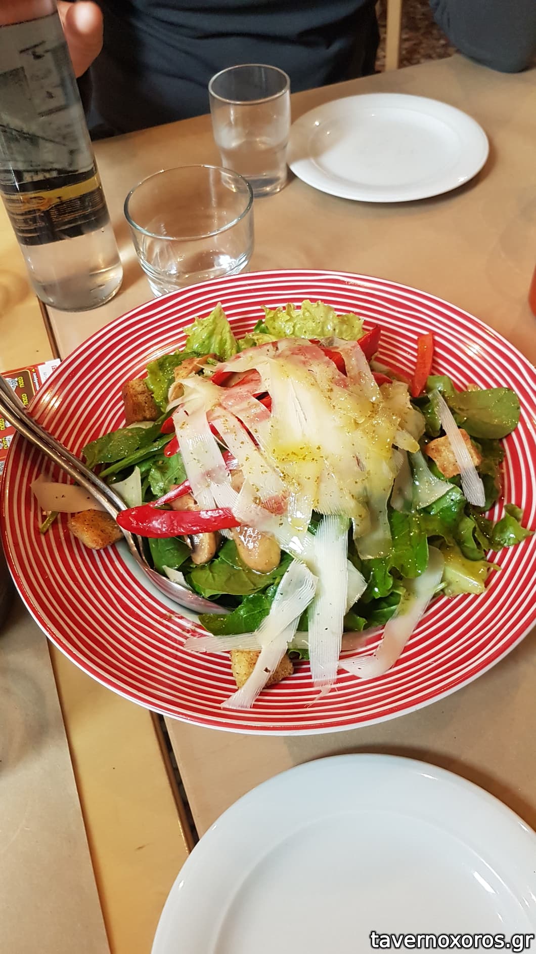 "Πράσινη σαλάτα, μαριναρισμένα μανιτάρια, κόκκινη πιπεριά, κρουτόν και γραβιέρα Νάξου" (οκ)