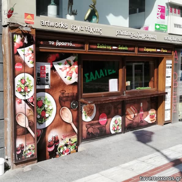Μικρό μαγαζί street food με μακαρονάδες και φρέσκες σαλάτες.