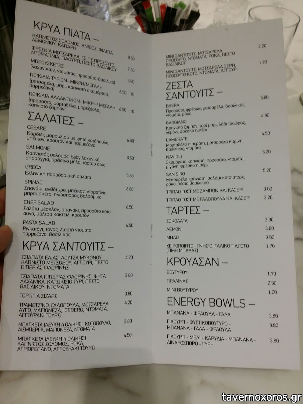 Ίδιος κατάλογος με το 2015, προσθέστε 2-3 ευρώ σε όλα τα προϊόντα. Το σαντουιτσάκι με προσούτο ήταν μια χαρά. Τιμές σίγουρα τσιμπημένες, αλλά τουλάχιστον οκ ποιότητα.
