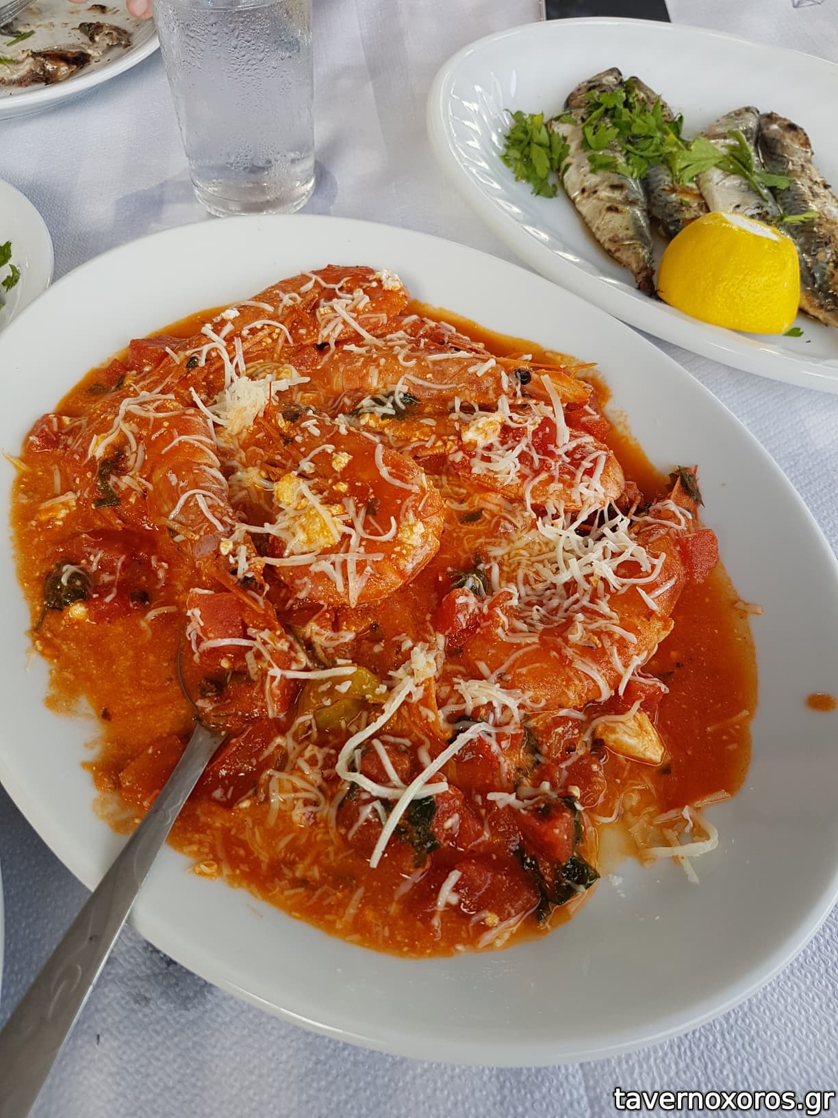 Γαρίδες σαγανάκι (μπορούσε και καλύτερα, γιατί με κονκασέ, μπόλικη ζάχαρη και τριμμένο τυρί πίτσας, μπορεί να γίνει νόστιμο αλλά όχι ποιοτικό)