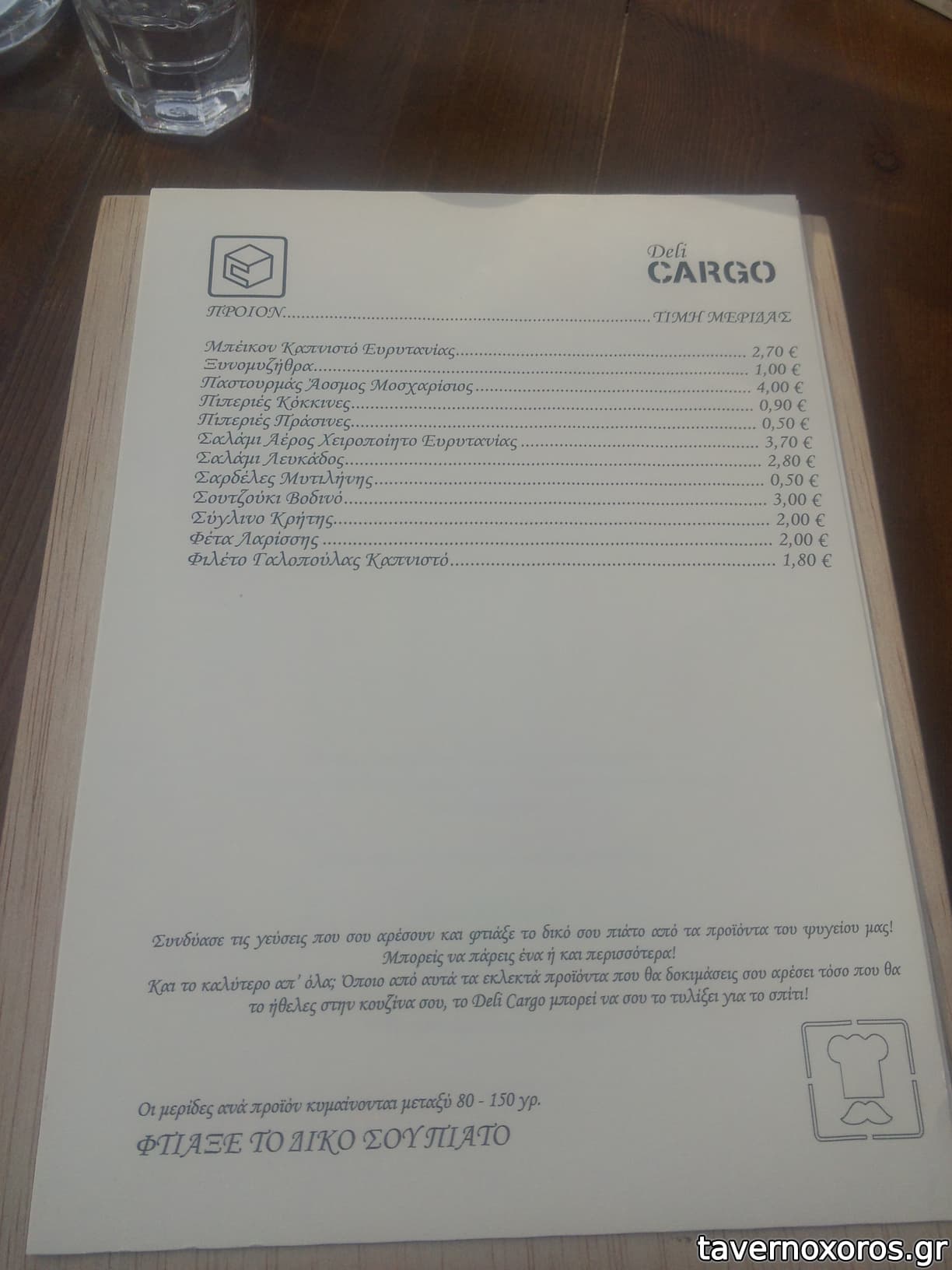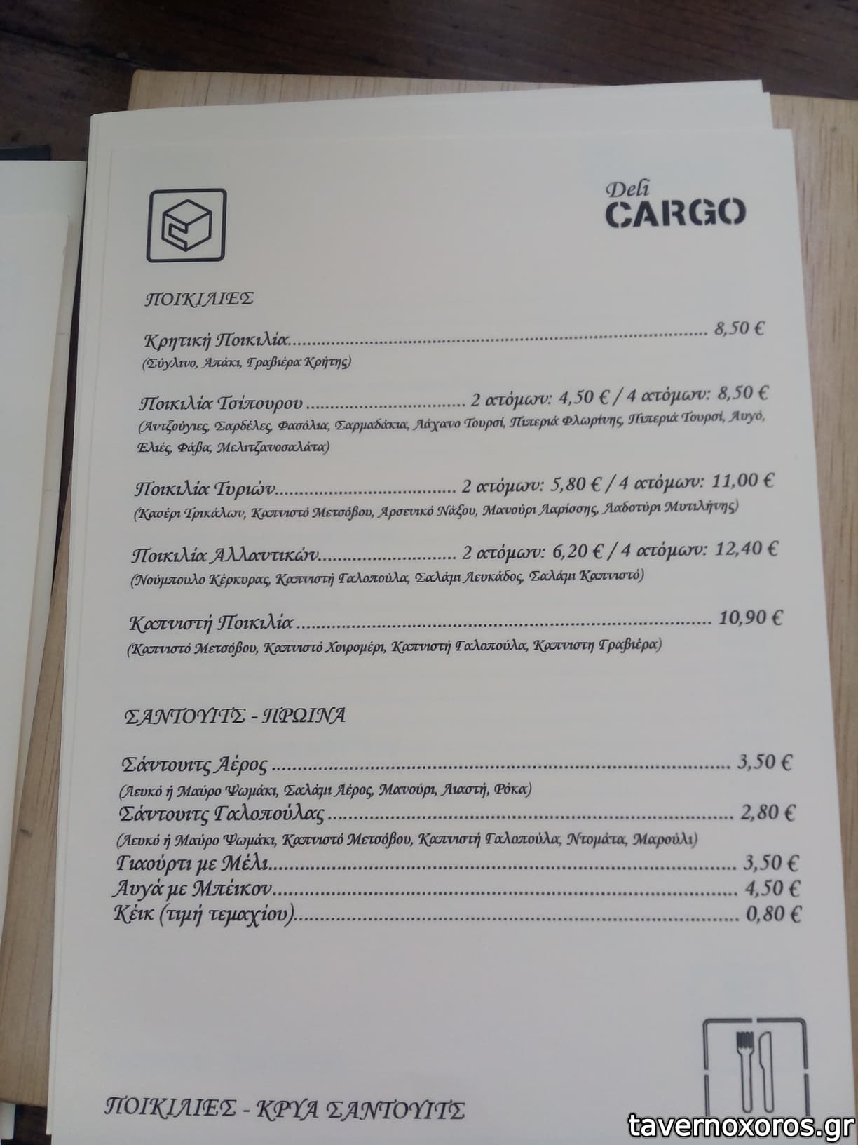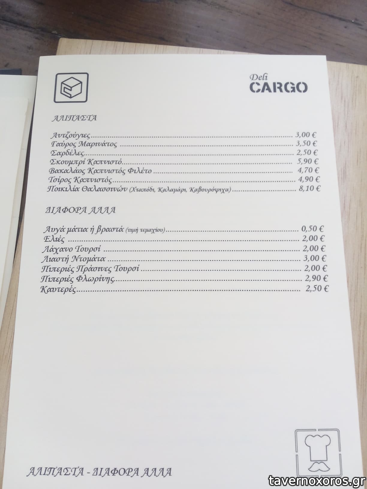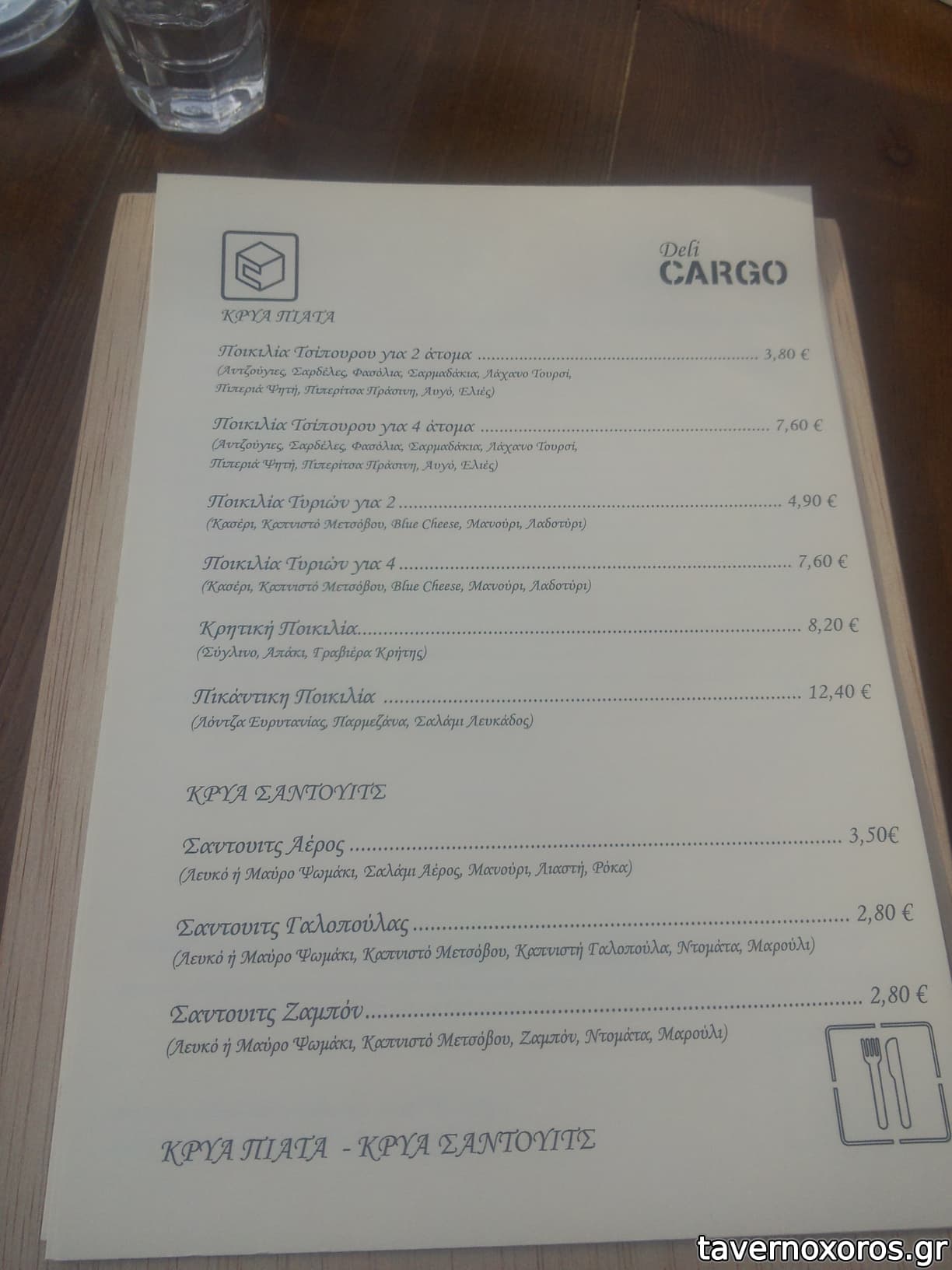 - Έχει καλή ποικιλία σε ούζο και λοιπά αλκοολούχα. Εξαιρετική ρακή. Αξίζει να δοκιμάσετε το αρκετά ενδιαφέρον κρητικό λευκό κρασί Ταμιωλάκη που παράγει συγγενής της ιδιοκτησίας. Από φαγητά έχει μικρή ποικιλία, τα περισσότερα είναι πρώτες ύλες, δηλαδή τυριά-αλλαντικά κτλ και μεζεδάκια. Από ζεστά, έχει τηγάνι και φούρνο, όχι σχάρα.
