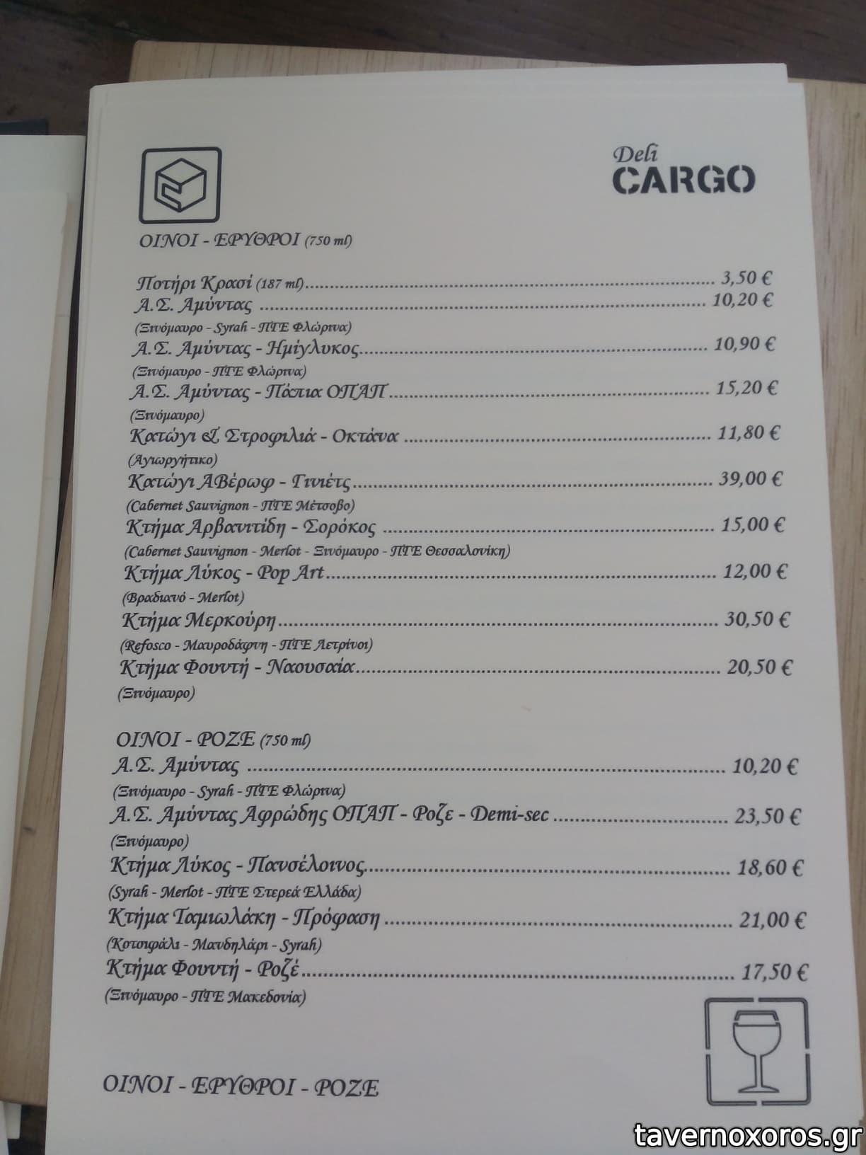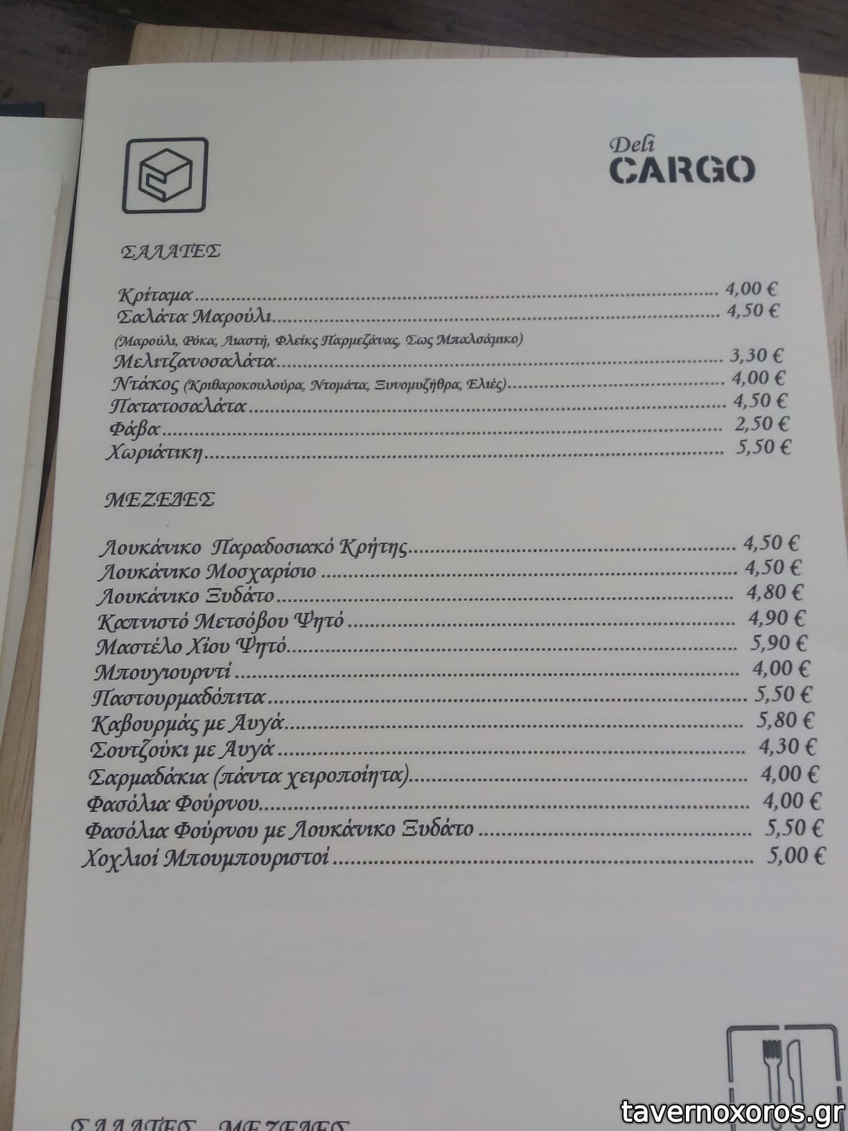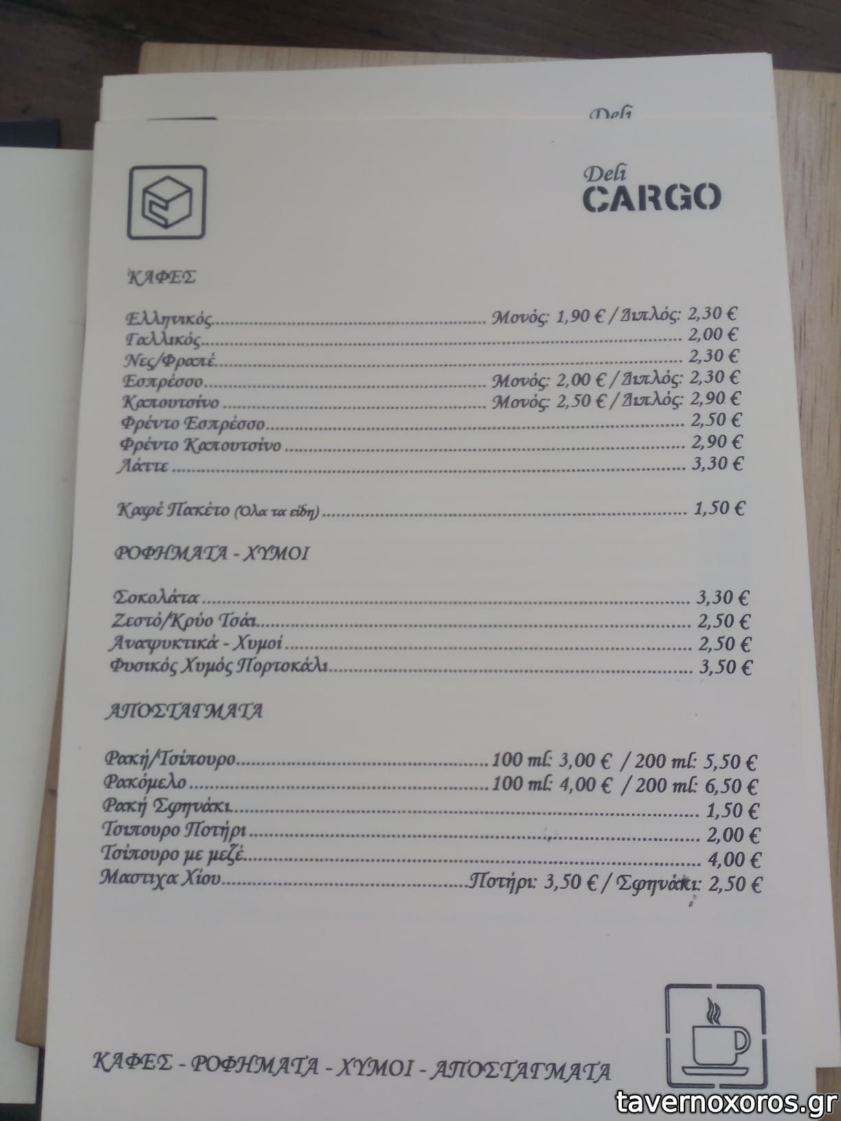 - Έχει καλή ποικιλία σε ούζο και λοιπά αλκοολούχα. Εξαιρετική ρακή. Αξίζει να δοκιμάσετε το αρκετά ενδιαφέρον κρητικό λευκό κρασί Ταμιωλάκη που παράγει συγγενής της ιδιοκτησίας. Από φαγητά έχει μικρή ποικιλία, τα περισσότερα είναι πρώτες ύλες, δηλαδή τυριά-αλλαντικά κτλ και μεζεδάκια. Από ζεστά, έχει τηγάνι και φούρνο, όχι σχάρα.