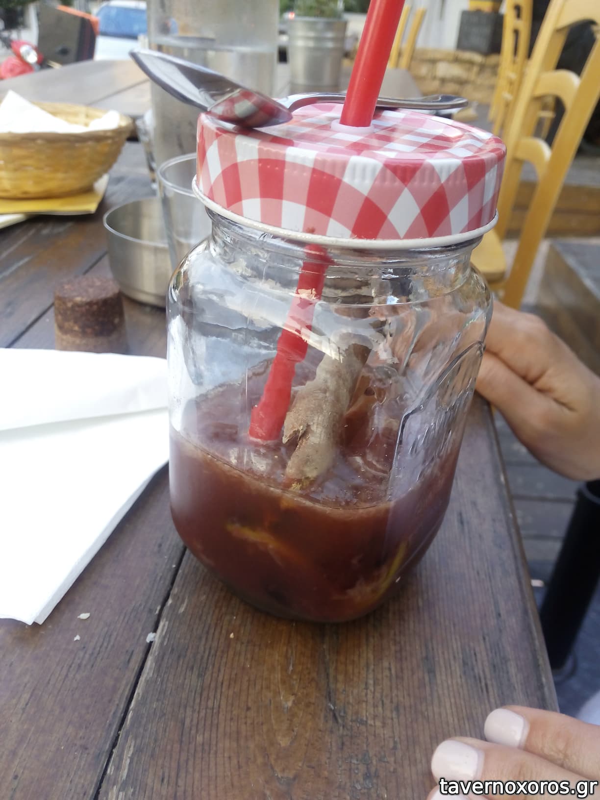 Greek cocktail: "τσίπουρο με γλυκάνισο, μοσχολέμονο, γλυκό του κουταλιού βύσσινο, stick κανέλας αρωματισμένη με ginger" (περίεργο, πικρό, ενδιαφέρον για μια δοκιμή)