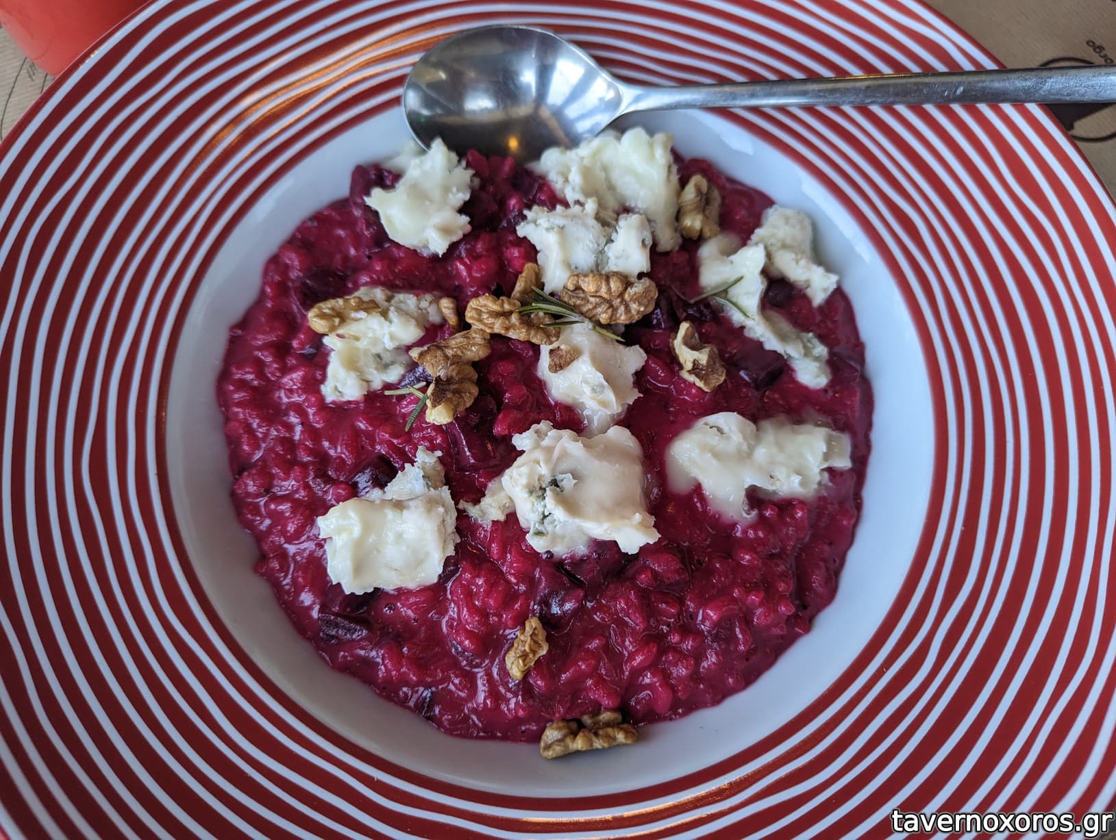 "Risotto al Barbabietole con Gorgonzola: ριζότο παντζαριού με gorgonzola, σκόρδο και καβουρδισμένα καρύδια, αρωματισμένο με φρέσκα μυρωδικά" (οκ, κάτι του ελείπε για να απογειωθεί)