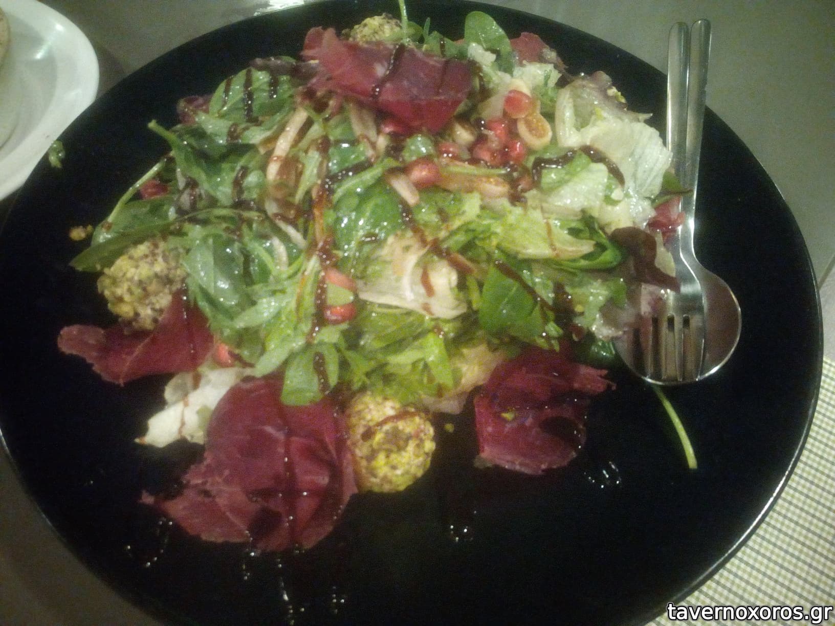 Σαλάτα με bresaola, σύκα και μπαλάκια τυριού με φυστίκι (καλή, αλλά τσιμπημένη 10-11 ευρώ)