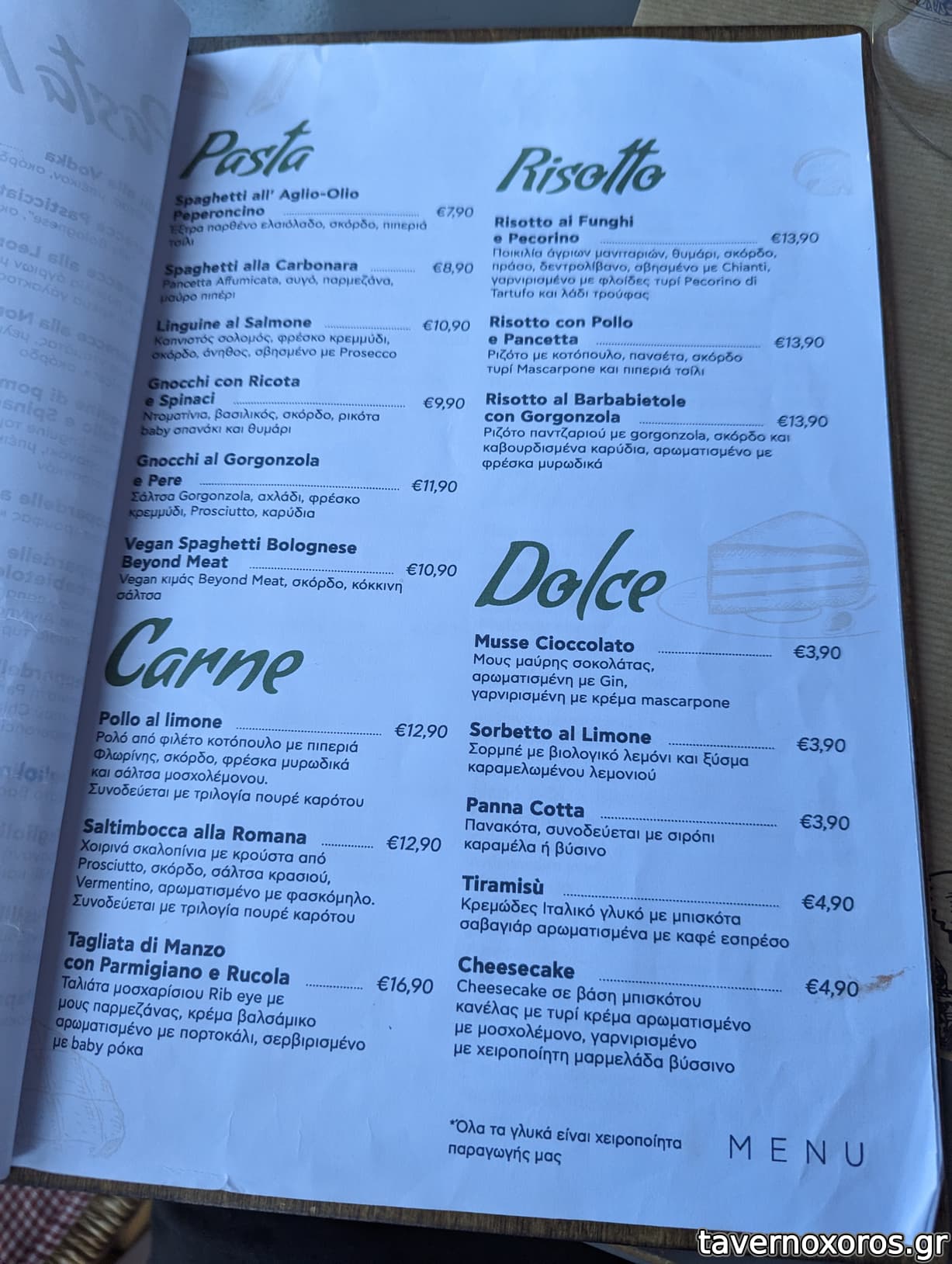 "Pappardelle Pancetta e Chianti: καπνιστή pancetta, πράσο, σκόρδο, με σάλτσα κρασιού Chianti και φλοίδες Pecorino aglio olio e peperoncinno" (μια χαρά, νόστιμη η σάλτσα κρασιού, οι παπαρδέλες αρκετά al dente)