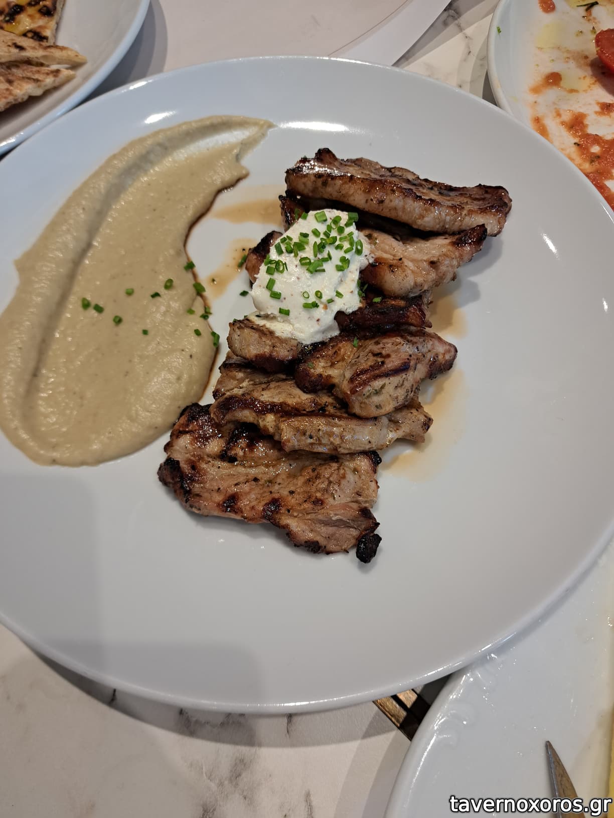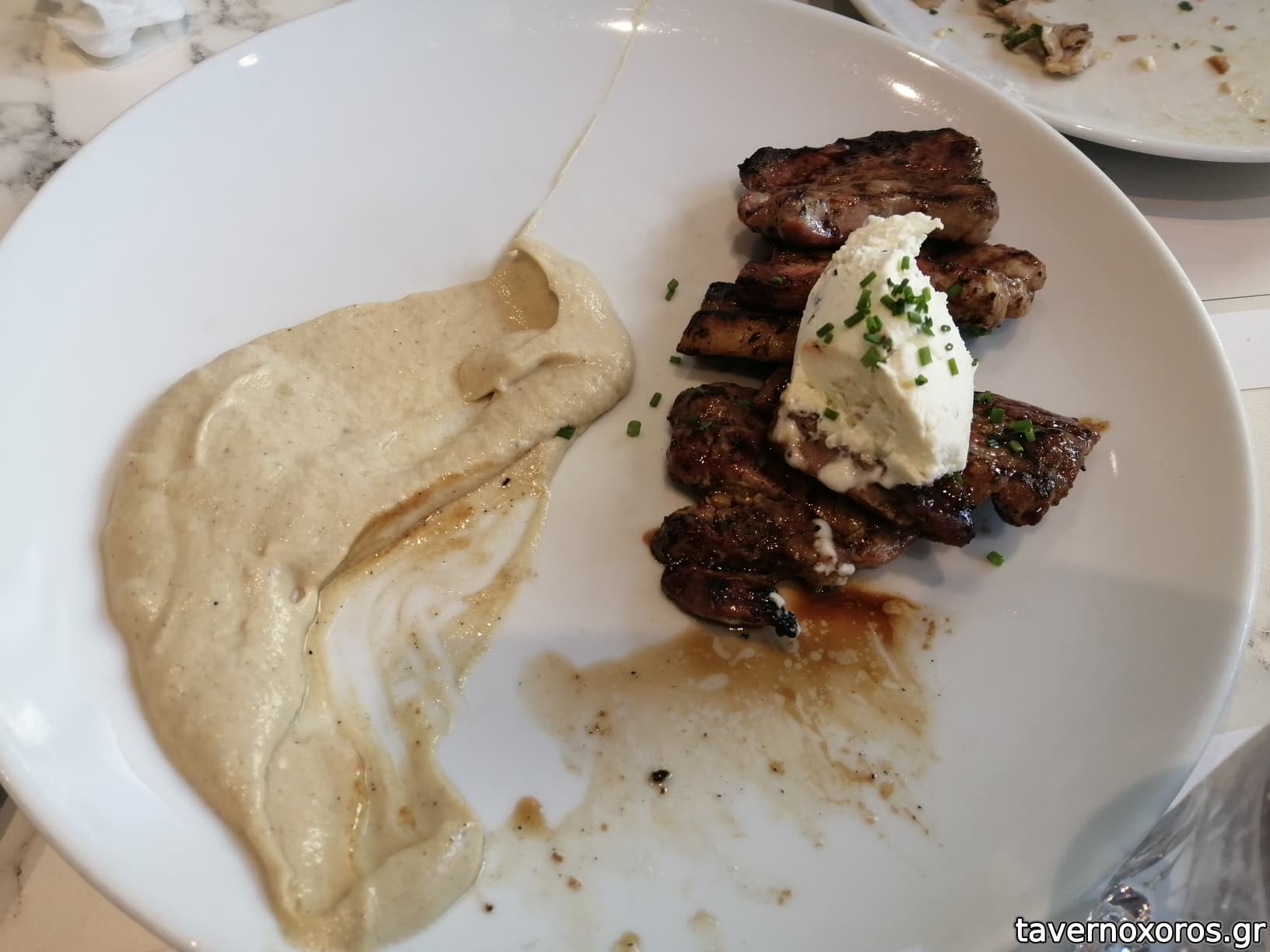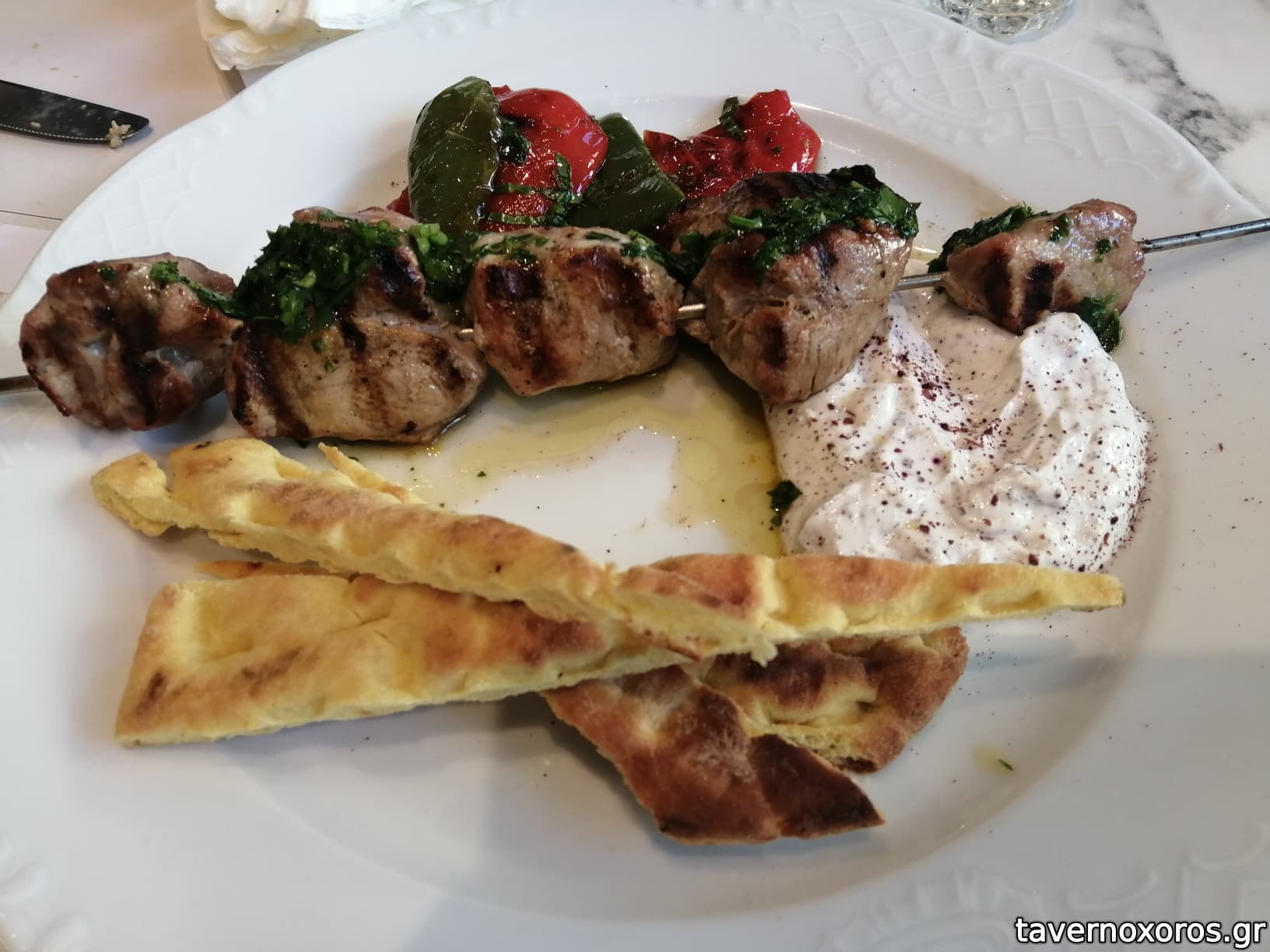 Από κυρίως το μοσχαρίσιο σουβλάκι ήταν αρκετά σκληρό, κάτι που σίγουρα οφείλεται στο παραψήσιμο, αλλά αυτό που με χάλασε ήταν ότι ήταν άγευστο, του έλειπαν μπαχάρια/καρυκεύματα και ιδίως το αλάτι. Το φιλεταρισμένο μπούτι κοτόπουλου ήταν σαφώς καλύτερο και πολύ μαλακό. Πάντως είχαν ωραίο στήσιμο τα πιάτα.