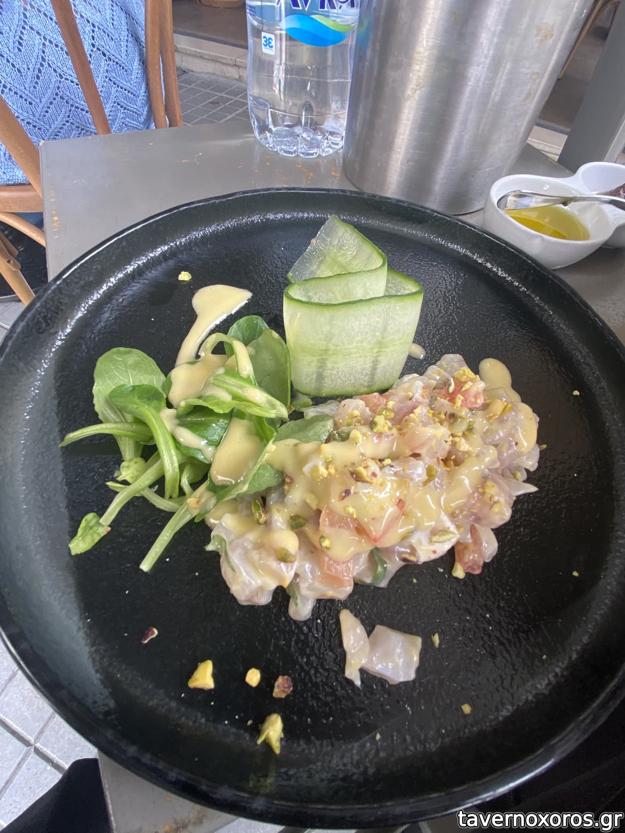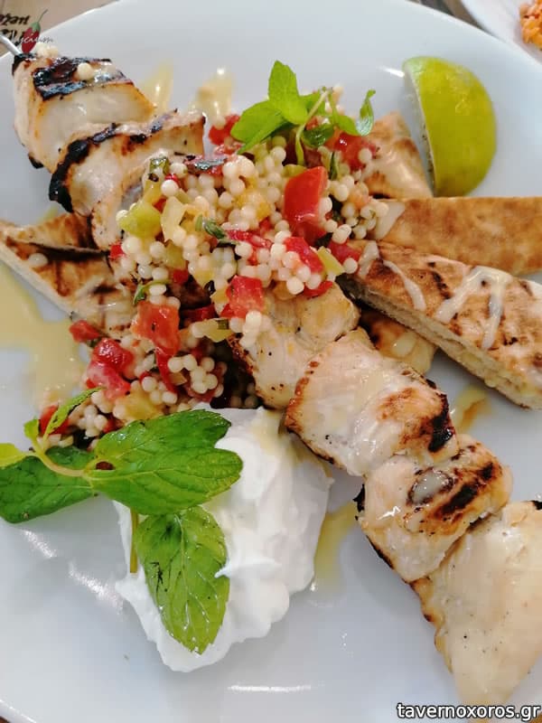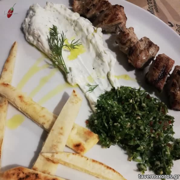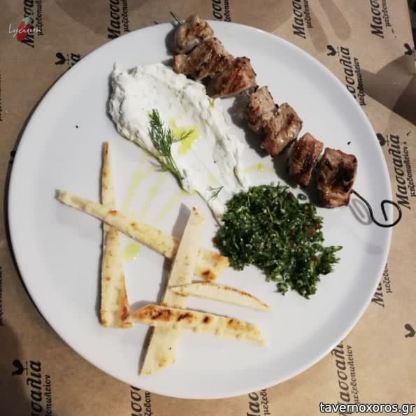 - Ψαρονέφρι κοντοσούβλι, συνοδευόμενο από σαλάτα ταμπουλέ (λίγη για συνοδευτικό) και τζατζίκι (καλό)